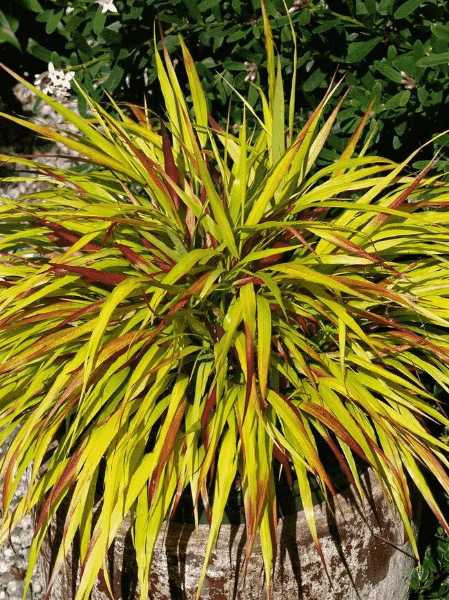 Хаконехлоа большая сорта *Sunflare* пленяет взор своей изысканной декоративностью и утончённой красотой. Это травянистое растение образует плотную куртинку высотой до полуметра, состоящую из тонких, слегка извилистых стеблей, покрытых узкими листьями длиной около 15–20 см. Листья имеют характерную золотисто-жёлтую окраску, особенно яркую весной и летом, постепенно приобретающую нежные оттенки оранжевого и бронзового цвета осенью. Верхняя сторона листа гладкая и блестящая, нижняя матовая, придающая растению особую глубину восприятия. Цветёт хаконехлоа мелкими невзрачными цветами, собранными в метельчатые соцветия, однако основное внимание привлекает именно её листва, играющая множеством оттенков от солнечного света. Растение предпочитает полутень и влажные плодородные почвы, прекрасно адаптируется к умеренному климату средней полосы России, украшая сады и парки своим живописным обликом круглый год.