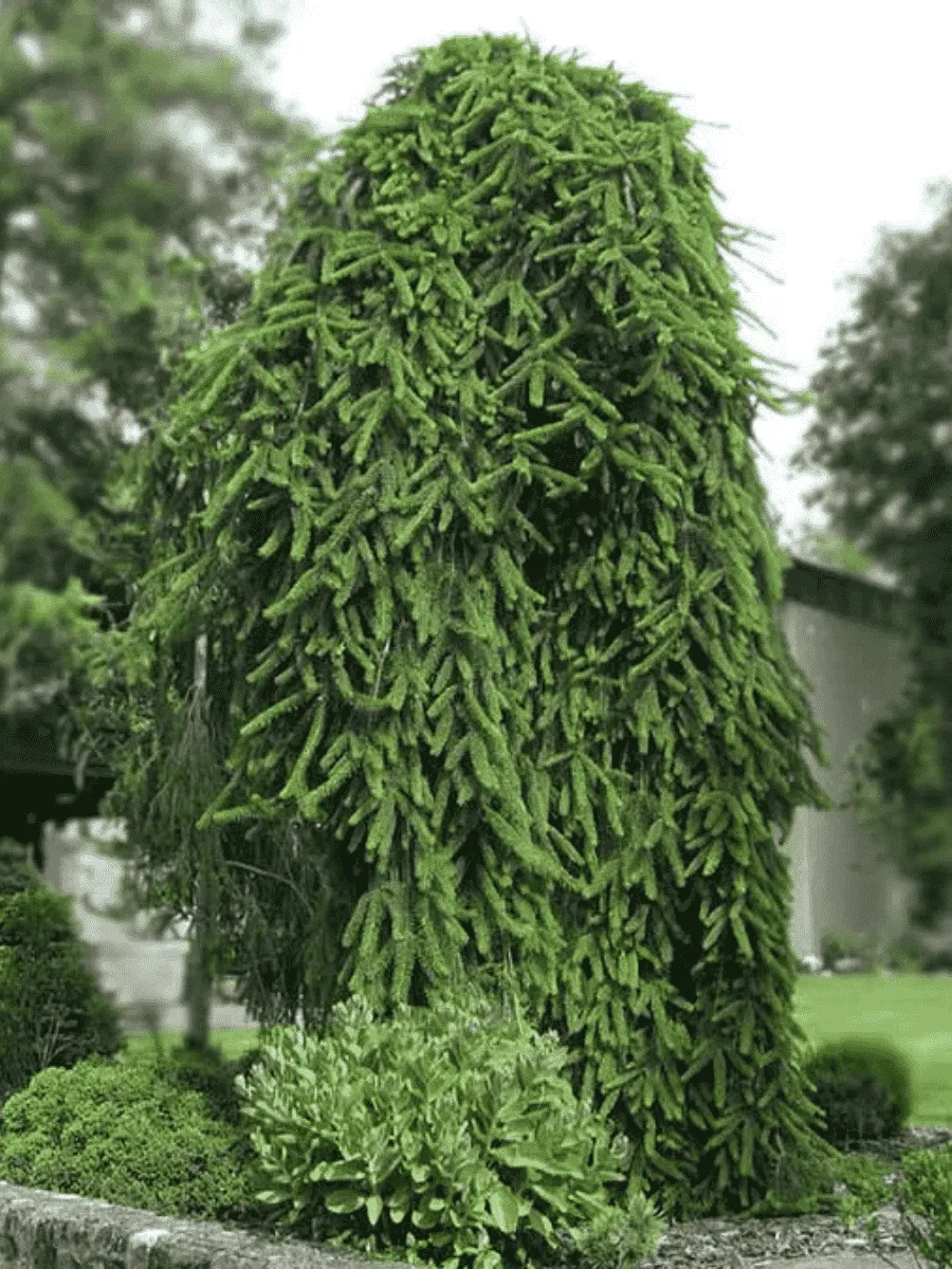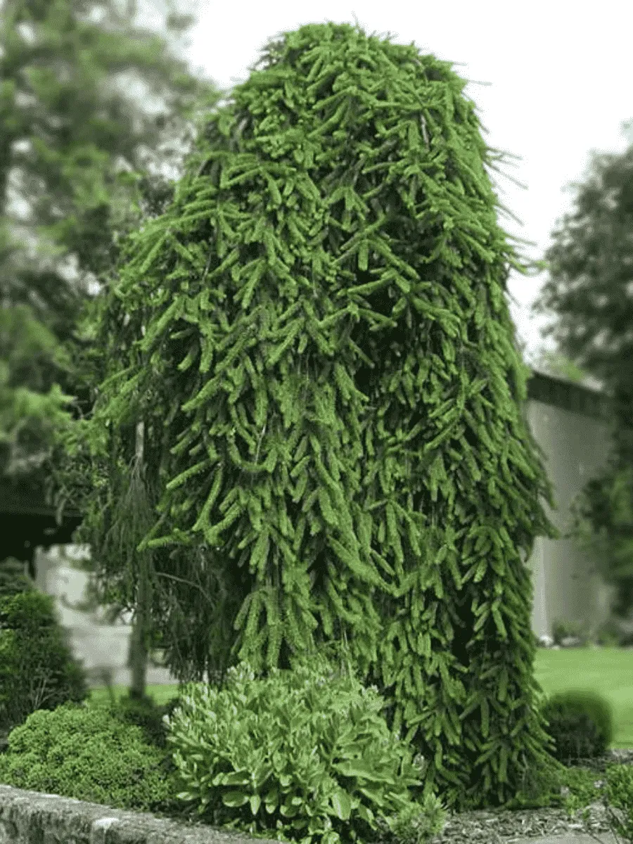 Ель обыкновенная Inversa представляет собой живописную разновидность широко известной европейской ели, отличающуюся необычной формой кроны, словно перевернутого зонта, устремленного вершиной книзу. Это медленнорастущее дерево обладает компактной пирамидальной кроной, ветви которой элегантно изгибаются дугами от ствола до земли, создавая эффект каскада зелени. Хвоя густо покрывает побеги, иголки короткие, мягкие, темно-зелёные, слегка блестящие, придающие растению благородный облик даже зимой. Цветение происходит весной, когда среди хвои появляются малозаметные шишечки красно-коричневого оттенка, постепенно превращающиеся в миниатюрные декоративные шишки. Растёт преимущественно в садах и парках умеренного климата Европы и Северной Америки, предпочитая плодородные почвы и полутень, где её уникальная форма раскрывается во всей красе.