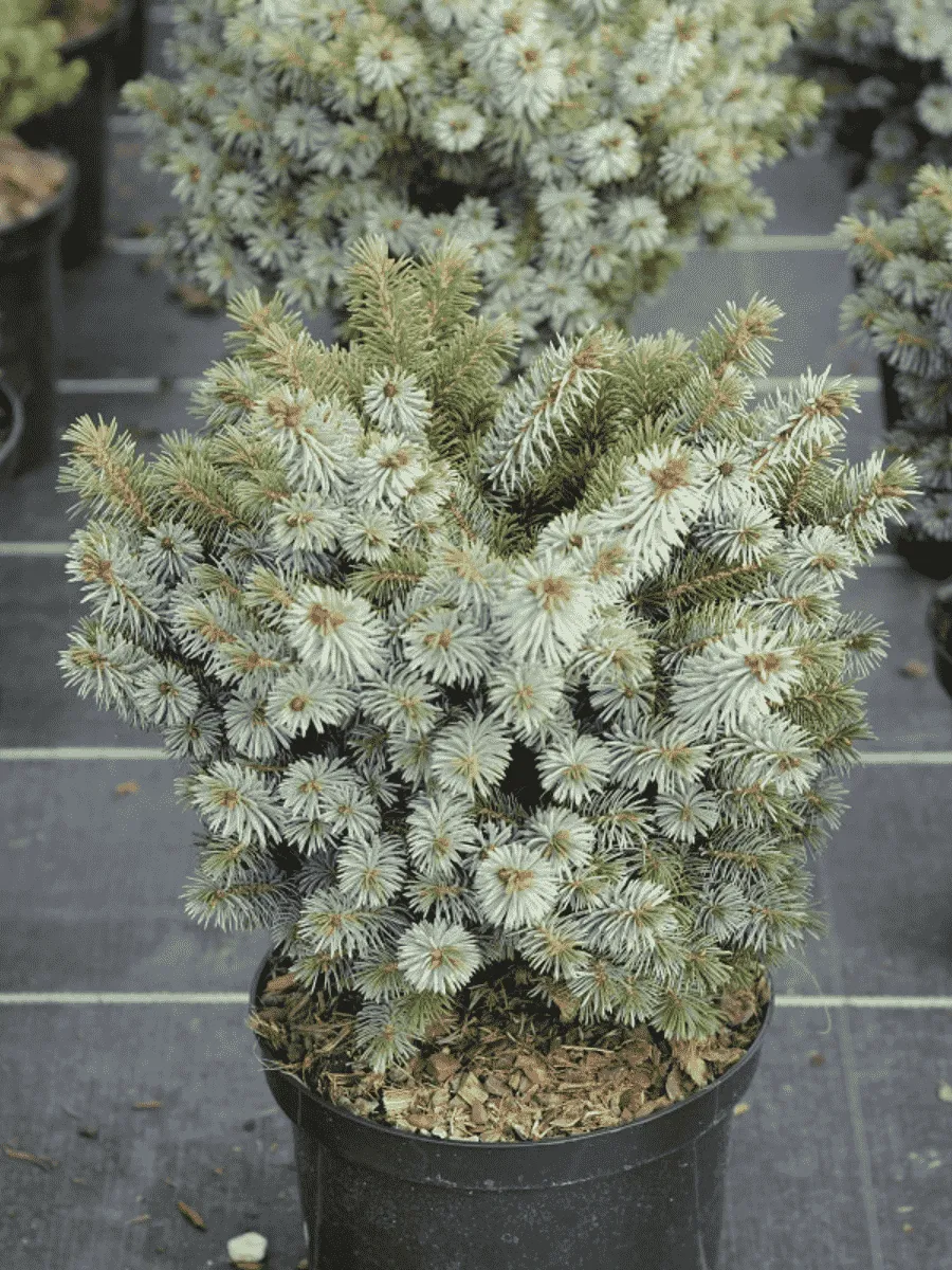 Ель ситхинская **Nana** представляет собой миниатюрную карликовую разновидность вечнозелёной хвойной красавицы, покоряющую сердца садоводов своей утончённой декоративностью и элегантностью форм. Это компактное деревце отличается медленным ростом, достигая зрелости лишь нескольких десятков сантиметров высоты, сохраняя при этом густое ветвление и аккуратную округлую крону. Иглы хвои короткие, мягкие, слегка загнутые вверх, окрашены в нежнейший серебристо-голубовато-зелёный оттенок, придающий растению особую воздушность и лёгкость. Цветёт растение незаметно мелкими шишечками, едва заметными среди густой зелени игл, однако истинная красота кроется именно в её изумительной форме и благородстве облика. Благодаря своим скромным размерам и неприхотливости эта очаровательная ёлочка прекрасно вписывается в альпийские горки, рокарии и миксбордеры, украшая садовые композиции изысканным северным очарованием.
