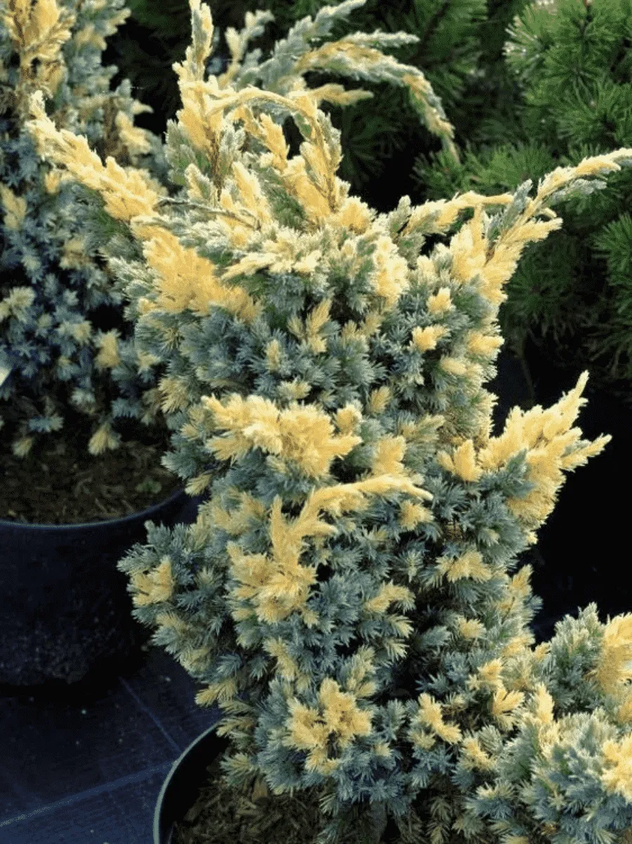 Можжевельник чешуйчатый *Golden Flame* представляет собой живописную вечнозелёную кустарниковую породу с компактной пирамидальной кроной, достигающей высоты до двух метров. Его густые ветви покрыты мелкими, плотно прижатыми друг к другу игловидными листьями насыщенного золотисто-жёлтого оттенка, который особенно ярко проявляется весной и летом, создавая эффект сияния среди зелёных насаждений. Растёт медленно, ежегодно прибавляя лишь несколько сантиметров, предпочитая солнечные места и хорошо дренированные почвы умеренных широт. Цветки практически незаметны, уступая место декоративности листвы, благодаря которой растение широко используется в ландшафтном дизайне парков, садов и частных участков, где оно служит ярким акцентом и украшением пространства круглый год.