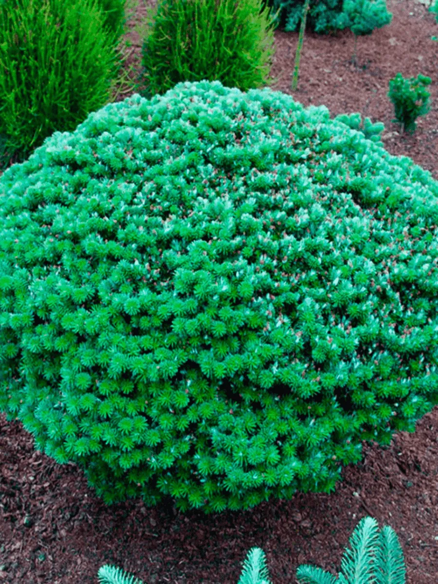 Пихта корейская 'Kristallkugel' представляет собой миниатюрную декоративную разновидность вечнозелёного хвойного дерева, отличающуюся компактной шаровидной формой кроны и медленным ростом. Её густые ветви покрыты нежнейшими игловидными листьями насыщенного тёмно-зелёного цвета, слегка блестящими и мягкими на ощупь. Хвоя расположена спирально вокруг ветвей, создавая эффект пушистого покрова, который особенно привлекателен зимой благодаря контрасту с белым снеговым покровом. Растёт медленно, ежегодно прибавляя всего несколько сантиметров, достигая зрелого возраста высоты около одного метра. Цветение пихты корейской практически незаметно, поскольку её мелкие шишечки скрыты среди густой хвои и малозаметны даже вблизи. Благодаря своей неприхотливости и устойчивости к городским условиям эта карликовая форма широко используется в ландшафтном дизайне для украшения садов, парков и городских пространств, где она служит ярким акцентом круглый год.