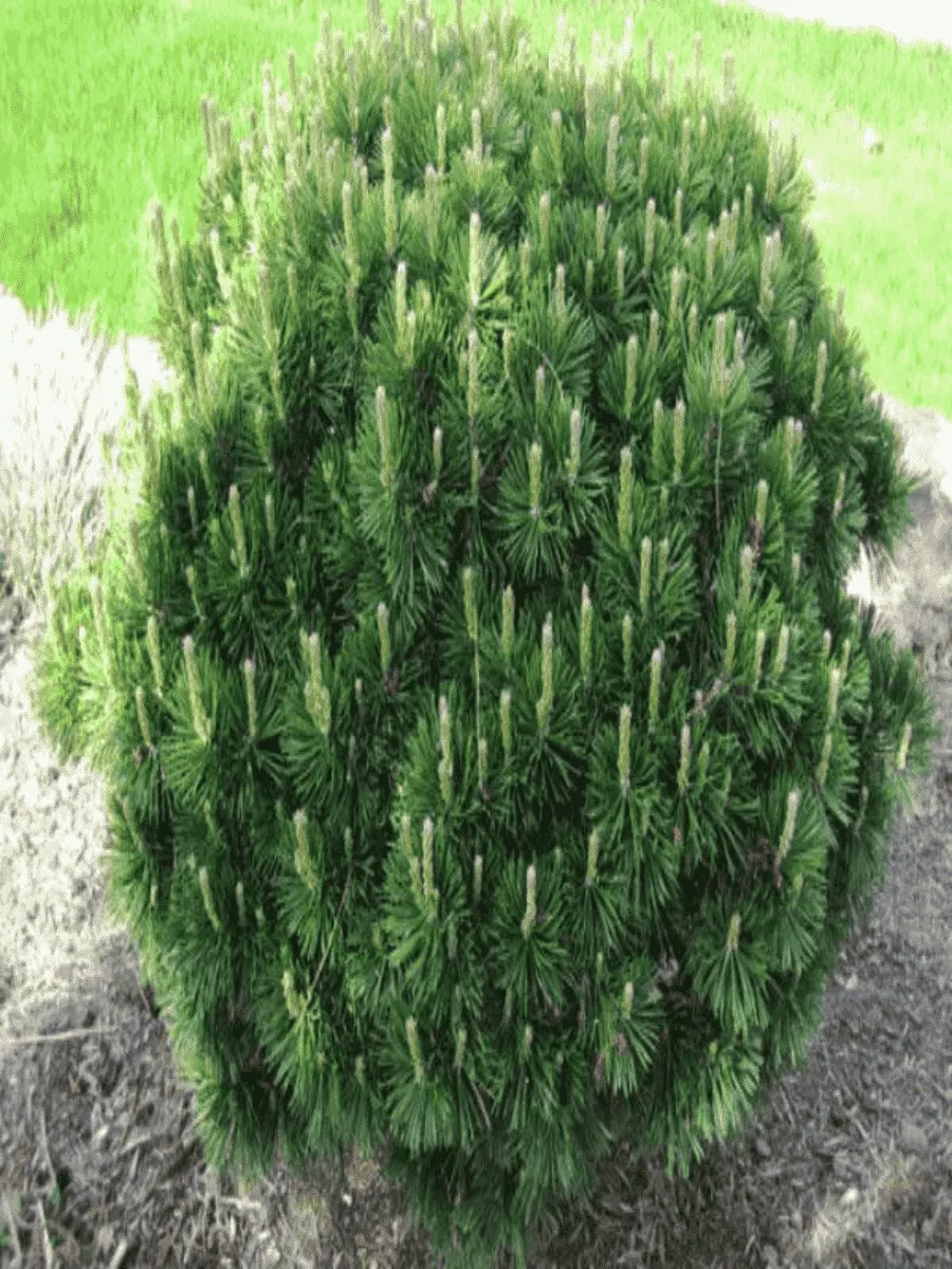 Сосна горная сорта *«Gnom»* представляет собой компактную карликовую разновидность сосны, достигающую высоты около восьмидесяти сантиметров. Её густые ветви образуют аккуратную округлую крону, придающую растению декоративность даже зимой. Иглы короткие, тёмно-зелёные, собраны попарно, создавая плотную хвою, благодаря которой растение выглядит пышным и нарядным круглый год. Цветёт сосна мелкими жёлтыми мужскими шишечками и малозаметными красноватыми женскими соцветиями весной, однако основное внимание привлекает её элегантная форма кроны и насыщенный оттенок игл. Растение отличается медленным ростом, устойчивостью к неблагоприятным условиям среды и неприхотливостью в уходе, прекрасно подходит для каменистых садов, альпинариев и небольших декоративных композиций.