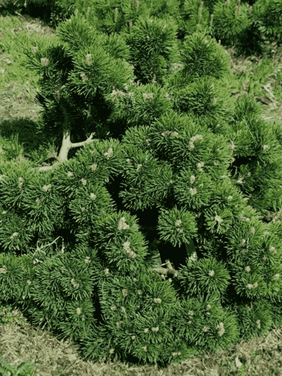 Сосна горная *Pinus mugo* Jakobsen — вечнозелёное хвойное дерево или кустарник, обладающее компактной кроной и медленным ростом, придающим ей особую декоративность. Стройные ветви густо покрыты короткими игловидными листьями тёмно-зелёного цвета, собранными попарно в пучки, словно миниатюрные зелёные кисти художника. Иглы сосны горной плотные, жёсткие, слегка блестящие, сохраняют свежесть круглый год, создавая живописную картину даже зимой среди снежных просторов. Цветёт растение мелкими жёлтыми мужскими шишечками и красноватыми женскими соцветиями, расположенными преимущественно на концах ветвей. Благодаря своей неприхотливости и устойчивости к суровым условиям произрастания, сосна горная широко распространена в горных районах Европы, где она украшает альпийские луга и склоны, придавая ландшафту особый колорит и очарование.