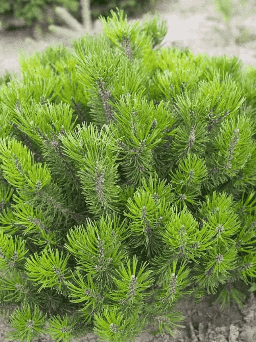 Сосна горная сорта *Mughus* — миниатюрное дерево или кустарник с живописной кроной, раскидистой и асимметричной формой ветвей, придающей растению особую декоративность и очарование. Её иглы короткие, густые, насыщенно-зелёные, слегка сероватые от воскового налёта, собраны в пучки по две штуки, создавая плотную хвою, словно мягкую бархатную шубу, укрывающую ветви. Цветёт сосна невзрачно, формируя небольшие шишечки, едва заметные среди густой зелени. Растёт медленно, предпочитая каменистые почвы и солнечные места, легко адаптируясь даже к суровым условиям высокогорья. Благодаря своей компактности и неприхотливости широко используется в ландшафтном дизайне, украшая альпийские горки, рокарии и сады камней, где её элегантная форма и благородная зелень создают атмосферу гармонии и спокойствия.