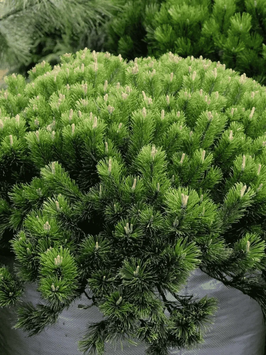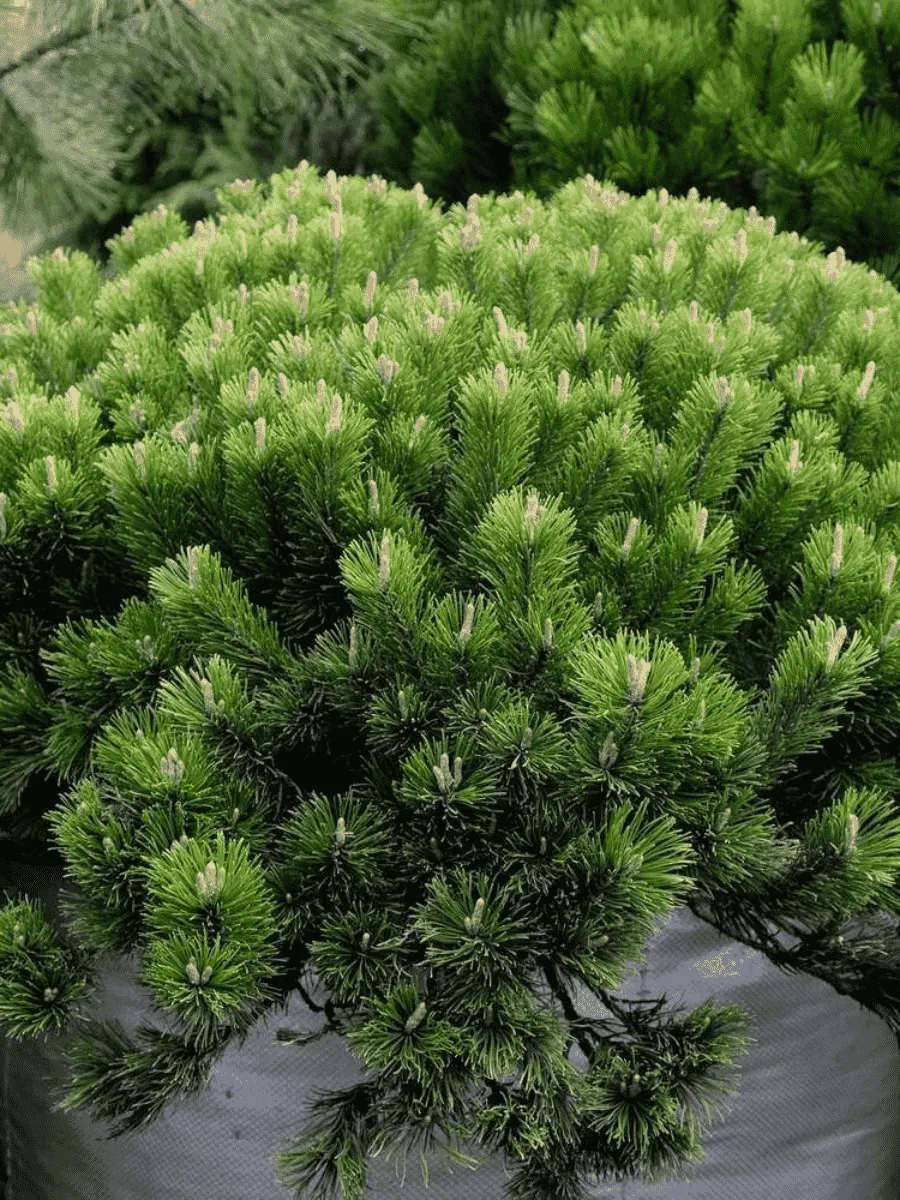 Сосна горная *Pumilio* — миниатюрное хвойное дерево, покорившее сердца садоводов своей живописной формой и неприхотливостью. Это карликовое растение достигает всего лишь нескольких метров высоты, обладая густой раскидистой кроной, придающей ей сходство с пушистым зелёным облаком. Иглы сосны короткие (около 4 см), мягкие, слегка загнутые, насыщенно-зелёного цвета с лёгким серебристым отливом, благодаря чему крона кажется переливающейся на солнце. Растёт медленно, предпочитая каменистые почвы альпийских лугов Европы и Кавказа, где её компактность позволяет успешно противостоять суровым климатическим условиям высокогорья. Цветение происходит весной, когда среди хвои появляются небольшие шишечки красно-коричневого оттенка, постепенно превращающиеся в зрелые серо-коричневые шишки длиной около 5 сантиметров. Благодаря своему декоративному виду и устойчивости к неблагоприятным факторам среды, сосна горная широко используется в ландшафтном дизайне парков, альпинариев и рокариев, украшая собой самые разнообразные уголки сада.