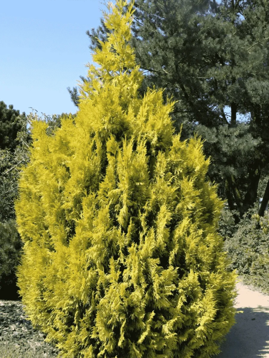 Туя складчатая сорта *Forever Goldy* представляет собой компактную вечнозелёную хвойную красавицу с густой пирамидальной кроной, достигающей высоты до двух метров и ширины около одного метра. Её игловидные листья имеют необычную золотисто-жёлтую окраску, особенно яркую весной и летом, плавно переходящую в бронзово-золотистую зимой, создавая эффект переливающегося солнечного света среди зелёной массы сада. Хвоя мягкая, нежная на ощупь, расположена густо, придавая растению бархатистый облик. Цветёт растение незаметно мелкими невзрачными шишечками, однако именно декоративность хвои делает этот сорт привлекательным элементом ландшафтного дизайна. Растёт медленно, предпочитая солнечные места и плодородные почвы, устойчива к городским условиям и зимним холодам средней полосы России.