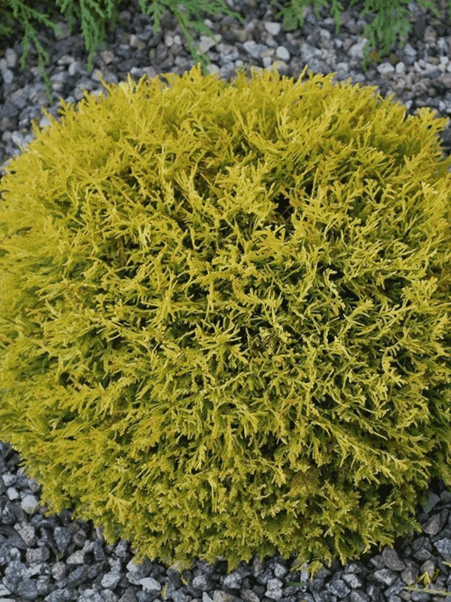 Туя западная сорта *Danica Aurea* представляет собой миниатюрную декоративную хвойницу, поражающую своей компактностью и изысканной золотисто-жёлтой окраской хвои. Это медленнорастущее растение формирует аккуратную округлую крону высотой до полуметра, сохраняя свою привлекательность круглый год благодаря яркому оттенку иголок, который особенно насыщенно проявляется весной и летом. Листья мелкие, чешуевидные, плотно прижаты друг к другу, создавая плотную структуру кроны, словно мягкую пушистую шапочку. Цветёт редко, цветы малозаметны и не представляют декоративной ценности. Растение предпочитает солнечные места, хорошо переносит стрижку и формовку, идеально подходит для небольших садов и рокариев, где оно становится ярким акцентом среди зелёной массы соседей.
