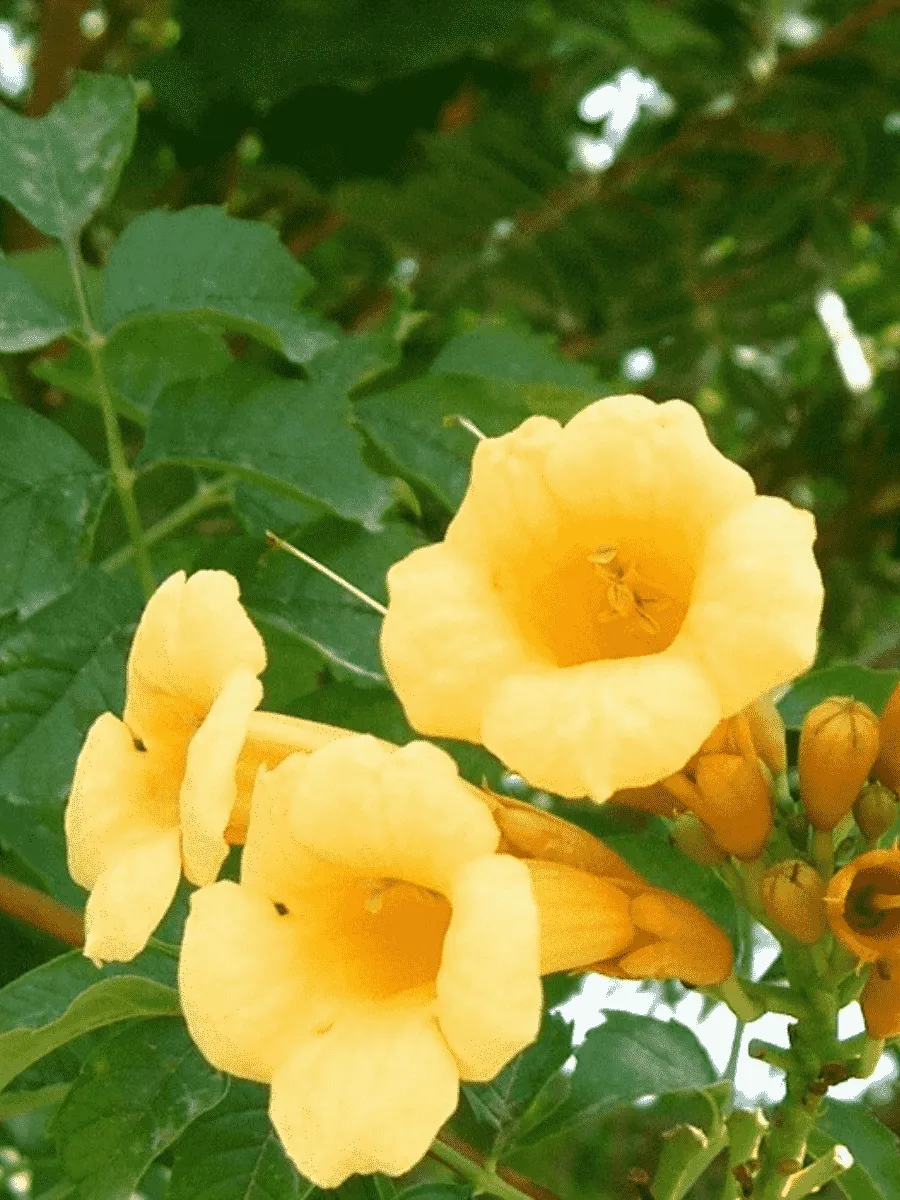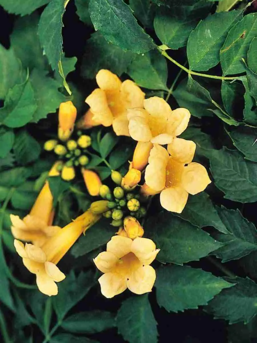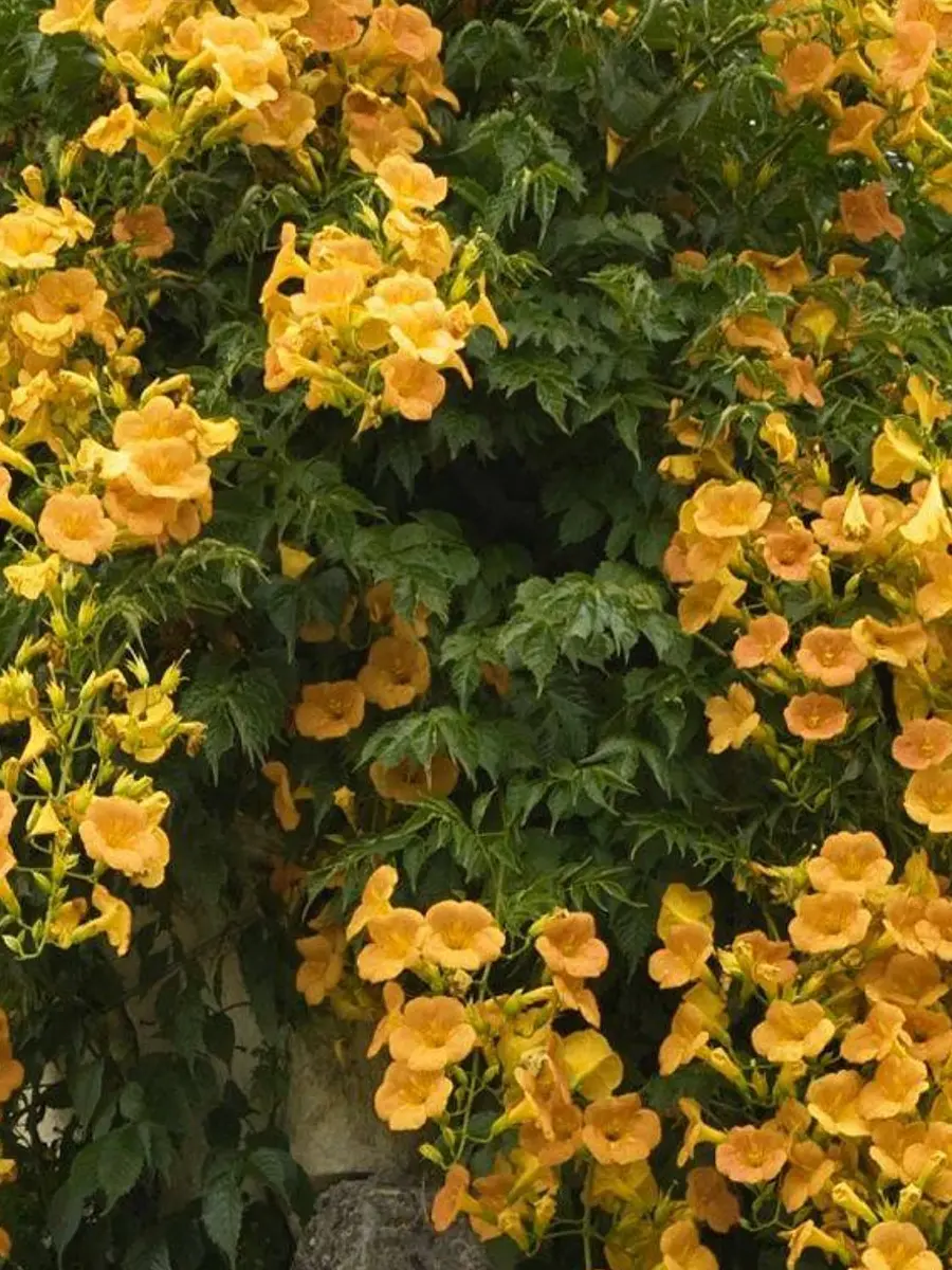 Кампсис укореняющийся сорта *Flava* — роскошная лиана, покоряющая сердца садоводов своей изысканной красотой и неприхотливостью. Стебли её гибки и сильнорослы, легко взбираясь вверх по опорам и стенам, словно стремясь прикоснуться к небу. Листья крупные, тёмно-зелёные, перисто-сложные, состоят из множества мелких листочков, придающих растению особую воздушность и лёгкость. Но истинную славу кампсиса составляют цветы — яркие жёлтые трубчатые цветки длиной до восьми сантиметров, собранные в пышные кисти, украшающие растение всё лето вплоть до осени. Цветение настолько обильно, что кажется, будто каждый побег окутан золотистым сиянием. Растёт быстро, разрастается мощно, охотно пускает корни от узлов стеблей, соприкасающихся с землёй, благодаря чему легко размножается и образует живописные зелёные завесы.