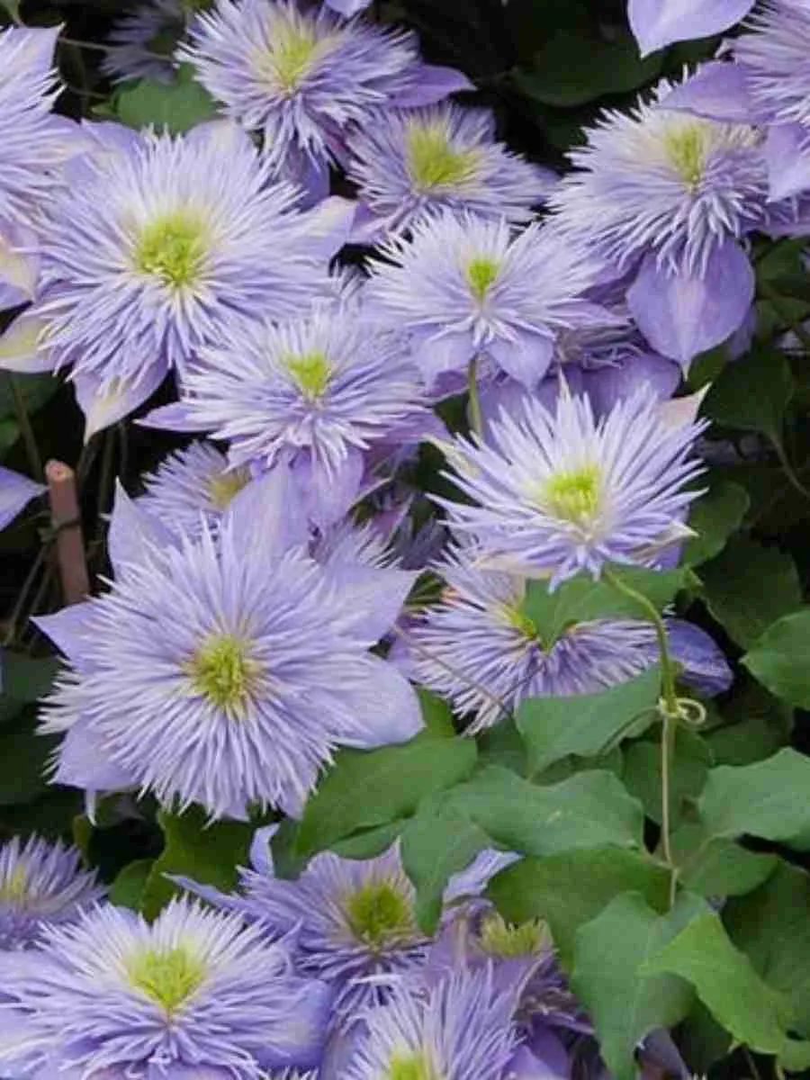 Клематис сорта *Cristal Fountain* пленяет взор изысканной красотой и нежностью цветения. Это элегантная лиана с гибкими побегами, достигающая высоты до трёх метров, украшенная крупными сердцевидными листьями насыщенного зелёного цвета, слегка блестящими и гладкими на ощупь. Цветки крупные, диаметром около десяти сантиметров, белоснежные, словно хрустальные капли росы, сияющие чистотой и свежестью среди зелени. Лепестков пять-шесть, широкие, округлые, плавно переходящие от основания к кончикам, создавая впечатление лёгкости и воздушности. Сердце цветка украшают многочисленные тычинки золотисто-жёлтого оттенка, придающие особую утончённость композиции. Растёт быстро, легко взбирается вверх по опорам, формируя живописную живую завесу, идеально подходящую для украшения беседок, пергол и стен зданий. Предпочитает солнечные места, плодородные почвы и умеренный полив, радуя глаз своим великолепием с июня по сентябрь.