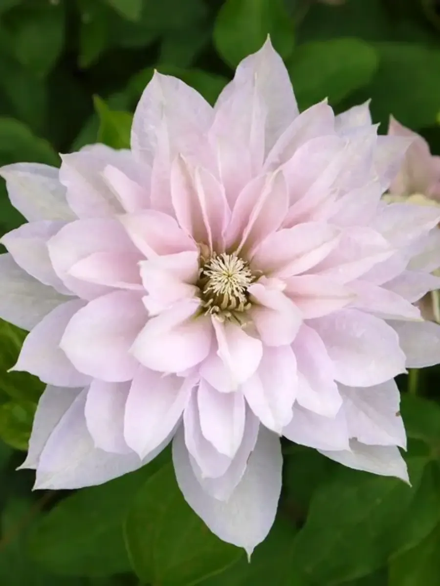 Клематис сорта *Dancing Queen* пленяет взор роскошной кроной крупных сердцевидных листьев насыщенного зелёного цвета, слегка блестящих от природы и придающих растению благородную элегантность. Его побеги гибки и сильнорослы, легко взбираясь вверх по любой подходящей опоре, создавая живописные арочные композиции. Цветёт обильно и продолжительно, начиная с конца весны до глубокой осени, покрываясь множеством больших цветков диаметром около десяти сантиметров. Лепестки нежно-розового оттенка плавно переходят в кремово-белый центр, украшенный золотистыми тычинками, словно танцующие королевы среди зелени сада. Этот сорт отличается неприхотливостью и устойчивостью к болезням, прекрасно адаптируясь к различным условиям выращивания и радуя садоводов своей красотой долгие годы.