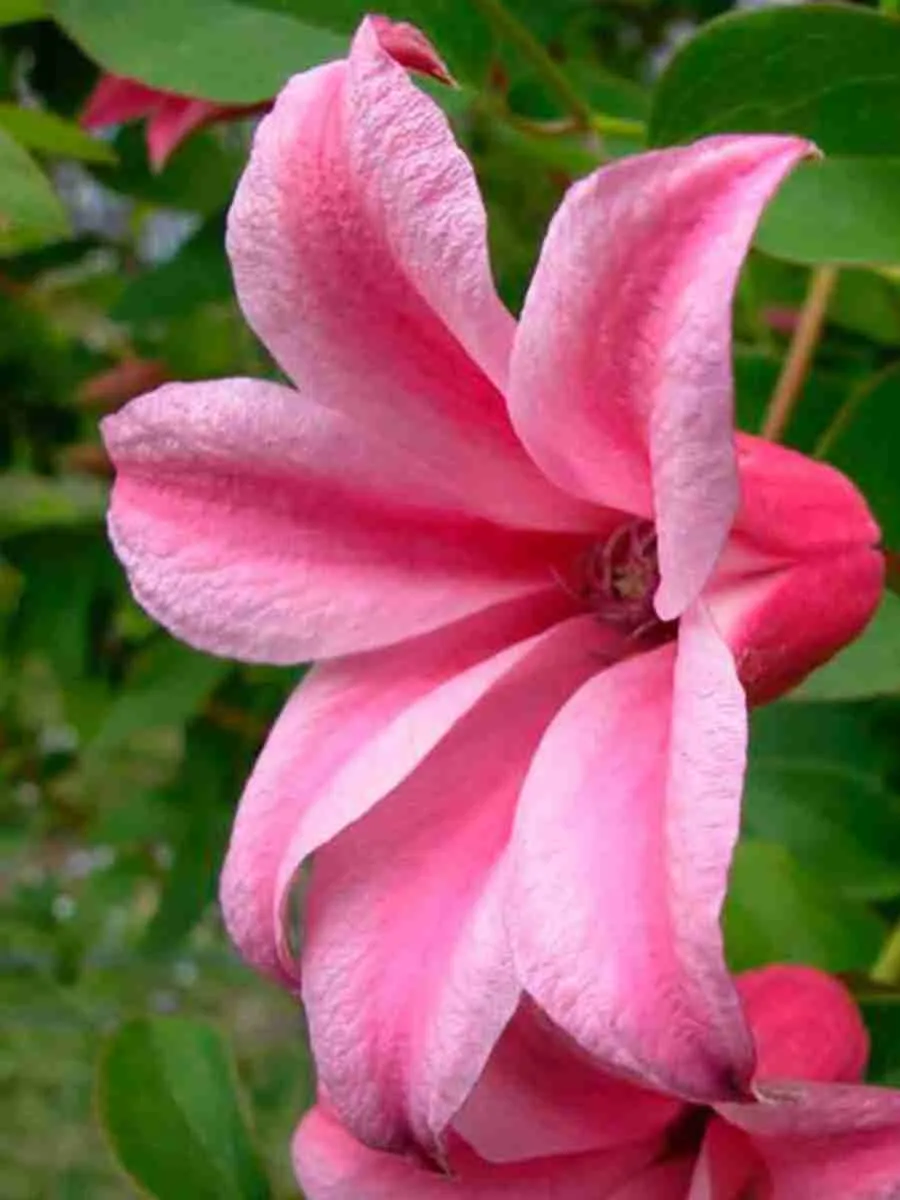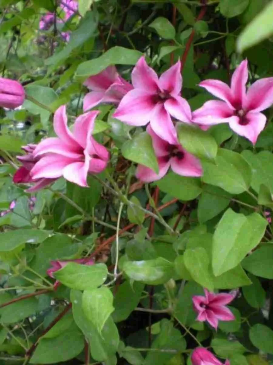 Клематис **Duchess of Albany** пленяет взор нежностью крупных цветков нежно-розового оттенка, украшенных золотистыми тычинками, словно драгоценности, сверкающие среди зелени лиан. Листья растения имеют сложную перистую структуру, состоящую из нескольких овальных листочков с зубчатыми краями, придающих облику утончённую изысканность. Цветки распускаются обильно, покрывая побеги пышной шапкой соцветий, создавая впечатление роскошного букета, бережно поддерживаемого гибкими стеблями. Этот сорт отличается энергичным ростом, легко взбираясь вверх по шпалерам и решёткам, превращаясь в живописную живую ширму, способную украсить любой садовый уголок. Период цветения продолжительный, начинается в конце весны и продолжается до середины лета, даря окружающим радость от созерцания своей чарующей красоты.