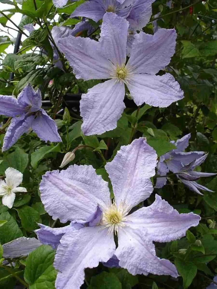 Клематис гибридный *Blekitny Aniol* пленяет взор нежностью небесной лазури своих крупных цветков, достигающих диаметра до 15 см, украшенных волнистыми лепестками, словно сотканными из утренней дымки. Листья растения перистые, рассечённые на несколько овальных листочков, покрытых тонким пушком, придающим им бархатистость и мягкость очертания. Цветоносы крепкие, поднимают соцветия высоко над листвой, позволяя каждому бутону раскрыться во всей красе. Период цветения продолжительный, начинается в июне и длится до конца августа, наполняя сад волшебством голубых оттенков. Растёт быстро, легко взбирается вверх по шпалерам и решёткам, достигая высоты около трёх метров, создавая живописную живую ширму или эффектный акцент среди зелёных насаждений.