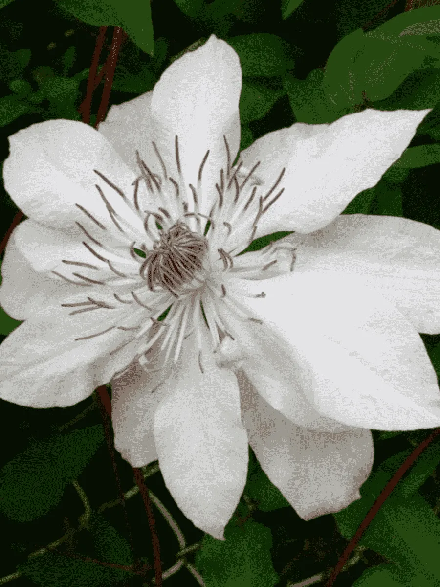 Клематис гибридный *Matka Urszula Ledóchowska* пленяет взор роскошью своего цветения и благородством облика. Это мощная лиана с гибкими побегами, достигающая высоты до трёх метров, украшенная крупными сердцевидными листьями насыщенного зелёного цвета, слегка блестящими и гладкими на ощупь. Цветки крупные, диаметром около десяти сантиметров, распускаются пышной волной летом и осенью, поражают нежностью оттенков от чистого белого до кремово-жёлтого с едва заметным лимонным оттенком, создавая впечатление изысканной фарфоровой росписи. Сердце цветка украшают многочисленные тычинки золотисто-жёлтой окраски, придающие особую воздушность композиции. Растение предпочитает солнечные места, хорошо дренированные почвы и требует опоры для полноценного развития своей красоты. Этот сорт отличается устойчивостью к болезням и неприхотливостью в уходе, радуя садоводов продолжительным периодом декоративности и способностью легко адаптироваться к различным условиям произрастания.