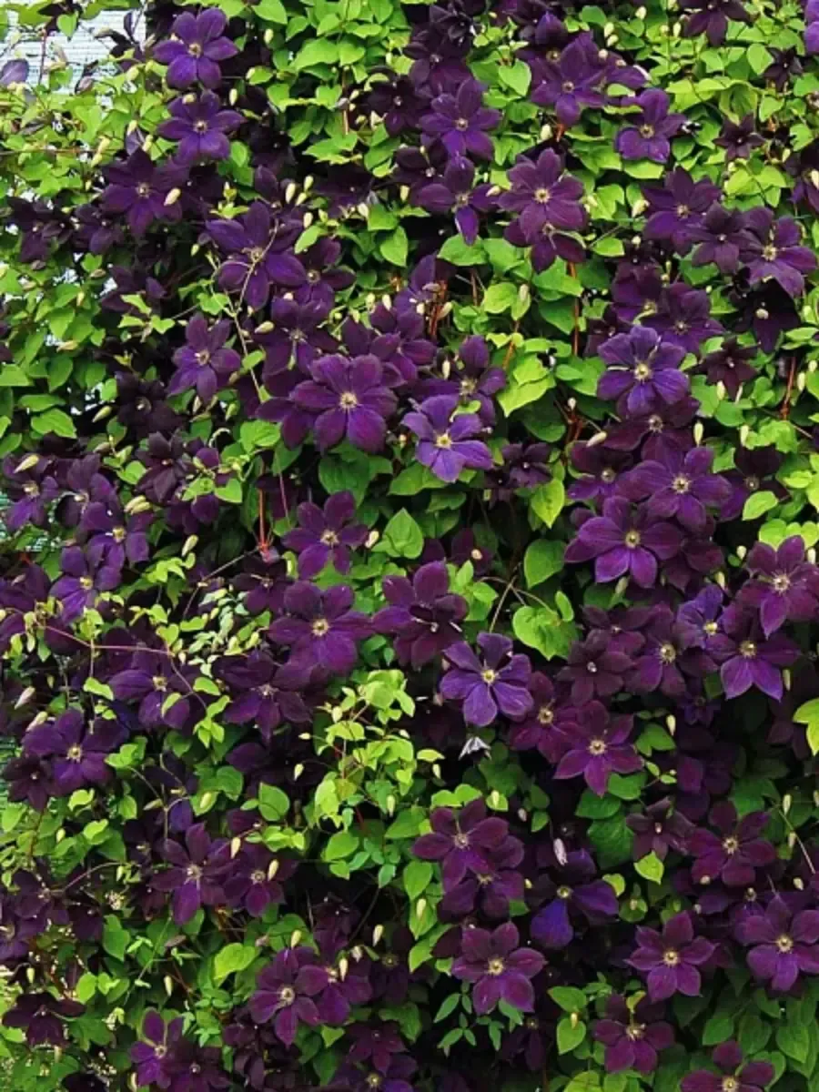 Клематис гибридный *Negritianka* пленяет взор роскошной зеленью крупных рассечённых листьев, словно вырезанных искусным мастером, оттеняющих великолепие цветков. Бутоны раскрываются крупными звёздчатыми цветами диаметром до 15 см, демонстрируя глубокую бархатисто-чёрную окраску лепестков, контрастирующую с золотистыми тычинками, придающими особую изысканность композиции. Цветение начинается в июне и продолжается до поздней осени, украшая сад нежностью и элегантностью. Растёт быстро, легко взбираясь вверх по шпалерам и решёткам, достигая высоты около трёх метров, создавая живописные зелёные стены и каскады цветов. Предпочитает солнечные места с плодородной почвой, устойчив к морозам средней полосы России, зимует без дополнительного укрытия, радуя садоводов своей неприхотливостью и декоративностью долгие годы.