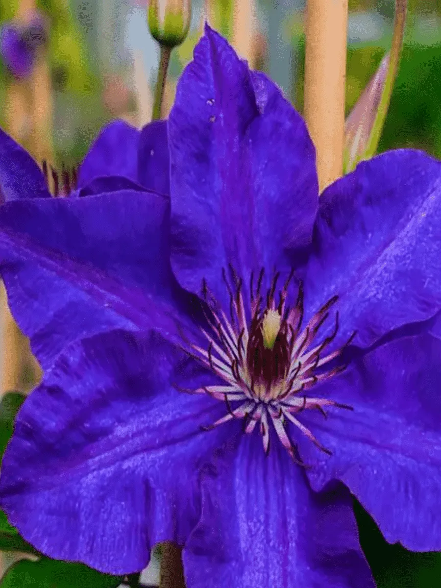 Клематис гибридный *The President* пленяет взор роскошной красотой крупных темно-фиолетовых цветков, словно бархатных лепестков, украшенных золотистыми тычинками, контрастирующими с глубоким оттенком венчика. Листья перистые, рассечённые на несколько листочков яйцевидной формы, ярко-зелёные, глянцевые, придающие растению элегантность и свежесть облика. Мощная лиана достигает высоты до трёх метров, стремительно обвивая опоры своими гибкими побегами, демонстрируя способность быстро распространяться и создавать живописную зелёную завесу. Цветёт обильно и продолжительно, начиная с конца весны и вплоть до осени, наполняя сад изысканным очарованием и утончённой прелестью своего цветения.