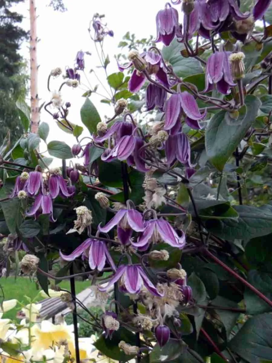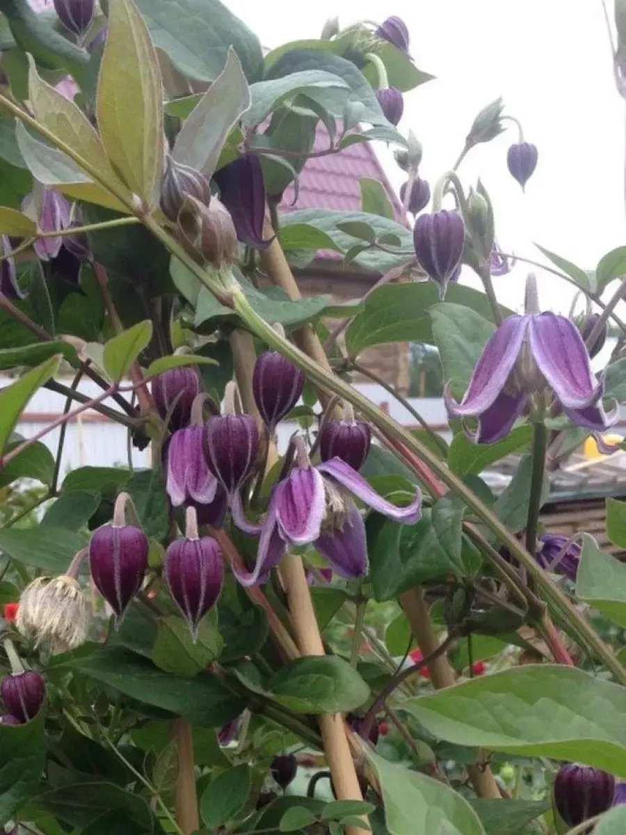 Клематис сорта *Jan Fopma* пленяет взор роскошной зеленью лианоподобных стеблей, густо покрытых крупными сердцевидными листьями насыщенного изумрудного оттенка, слегка гофрированными по краям и украшенными нежным блеском воскового покрытия. Цветки распускаются щедро и обильно, поражают своей величиной и элегантностью формы: крупные чашевидные бутоны раскрываются широкими лепестками глубокого винно-красного цвета с едва заметным пурпурным отливом, контрастируя с золотистыми тычинками, собранными в аккуратную центральную кисточку. Период цветения продолжительный, начинается ранней весной и длится до поздней осени, наполняя сад изысканным ароматом и живописным очарованием. Растение отличается стремительным ростом, легко взбирается вверх по шпалерам и решёткам, создавая пышные зелёные каскады, идеально подходящие для вертикального озеленения садов и парков.