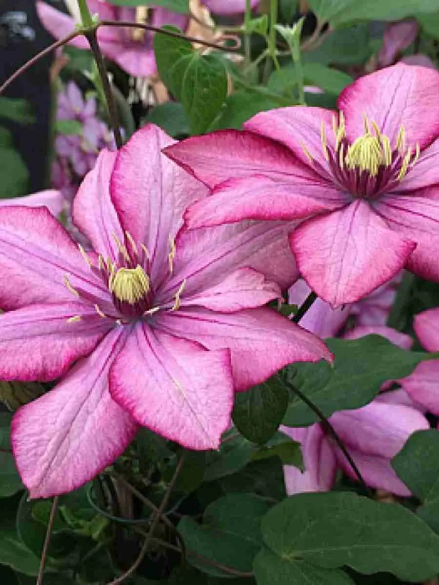 Клематис сорта *Paradiso* пленяет взор роскошью крупных цветков насыщенного сине-фиолетового оттенка, украшенных нежной белой каймой по краям лепестков, словно тонко очерченных кистью художника. Листья растения перистые, рассечённые на несколько пар ланцетных листочков тёмно-зелёного цвета с глянцевой поверхностью, придающей облику особую элегантность. Цветки распускаются обильно, начиная с конца весны до середины осени, создавая живописную картину пышного цветения, когда каждый бутон раскрывается навстречу солнцу, наполняя сад волшебством красок и ароматов. Стебли клематиса тонкие, гибкие, легко цепляются за опоры благодаря тонким усикам, позволяя растению уверенно подниматься вверх, достигая высоты от двух до трёх метров. Этот сорт предпочитает солнечные места, защищенные от сильных ветров, прекрасно чувствует себя на плодородных почвах умеренной влажности, радуя садоводов своей неприхотливостью и способностью быстро разрастаться, превращаясь в великолепный зелёный каскад цветов.