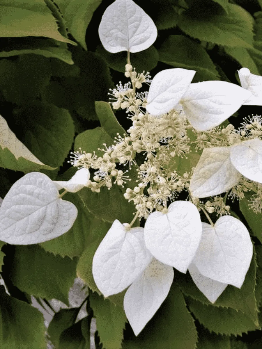 Схизофрагма гортензиевидная 'Moonlight' (Schizophragma hydrangeoides 'Moonlight') пленяет взор нежностью своего облика и утончённой красотой цветения. Это лиановидное растение обладает элегантной манерой роста, легко взбираясь вверх по опоре благодаря тонким усикам-плетям. Листья крупные, сердцевидные, слегка волнистые по краям, окрашены в насыщенный зелёный оттенок, который летом приобретает серебристо-сероватый отлив, словно отражающий лунный свет. Цветки собраны в пышные щитковидные соцветия диаметром около десяти сантиметров, состоящие из множества мелких белых цветков, окружённых крупными стерильными лепестками кремово-белого цвета, придающими растению сходство с гортензией. Период цветения начинается в конце весны и продолжается до середины лета, наполняя сад изысканным ароматом и очарованием. Растёт схизофрагма умеренно быстро, предпочитая полутень и плодородную влажную почву, прекрасно дополняя собой тенистые уголки сада своей воздушной лёгкостью и благородством форм.