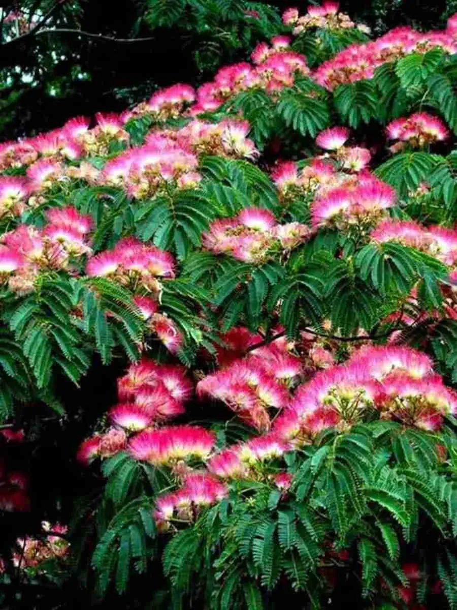 Альбиция ленкоранская — грациозная древесная красавица родом из субтропиков Кавказа и Ирана, покорившая сердца садоводов своей утончённой красотой и нежностью цветения. Это стройное дерево высотой до десяти метров обладает раскидистой кроной, словно воздушное кружево, состоящей из множества тонких ветвей, покрытых перистыми листьями изумрудной окраски, придающих ей особую лёгкость и ажурность. Листья дваждыперистые, состоят из мелких листочков, расположенных попарно вдоль оси, создавая впечатление пушистого зелёного облака над головой. Цветёт альбиция роскошно и продолжительно, покрываясь множеством ароматных белых цветков с длинными тычинками нежно-розового оттенка, похожими на миниатюрные звёздочки, мерцание которых привлекает внимание издалека. Растение предпочитает солнечные места, хорошо переносит засуху и жаркое лето, однако чувствительна к морозам и требует укрытия зимой в регионах с суровым климатом. Благодаря своему элегантному облику и длительному периоду декоративности, альбиция стала любимым объектом озеленения парков и частных садов, где она создаёт атмосферу тепла, света и гармонии природы.