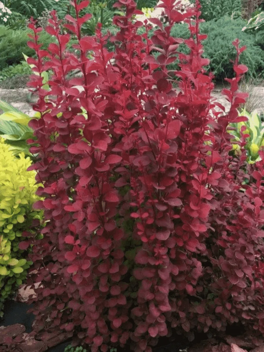 Барбарис Тунберга сорта **Red Rocket** представляет собой компактный кустарник пирамидальной формы высотой до полутора метров, отличающийся густой кроной и вертикальным направлением ветвей. Листья мелкие, плотные, насыщенно-красной окраски, придающие растению эффектную декоративность на протяжении всего сезона вегетации. Осенью листья приобретают ещё более интенсивный оттенок, становясь ярко-бордовыми, словно пламя костра. Цветки небольшие, жёлтые, появляются весной, создавая контраст с красноватой листвой и привлекая внимание своей нежностью среди ярких красок куста. Растёт медленно, устойчиво переносит морозы и засуху, предпочитая солнечные места и плодородные почвы. Благодаря своим миниатюрным размерам и яркой внешности барбарис Red Rocket широко используется в ландшафтном дизайне для создания живых бордюров, миксбордеров и одиночных посадок, украшая сады и парки ярким акцентом круглый год.