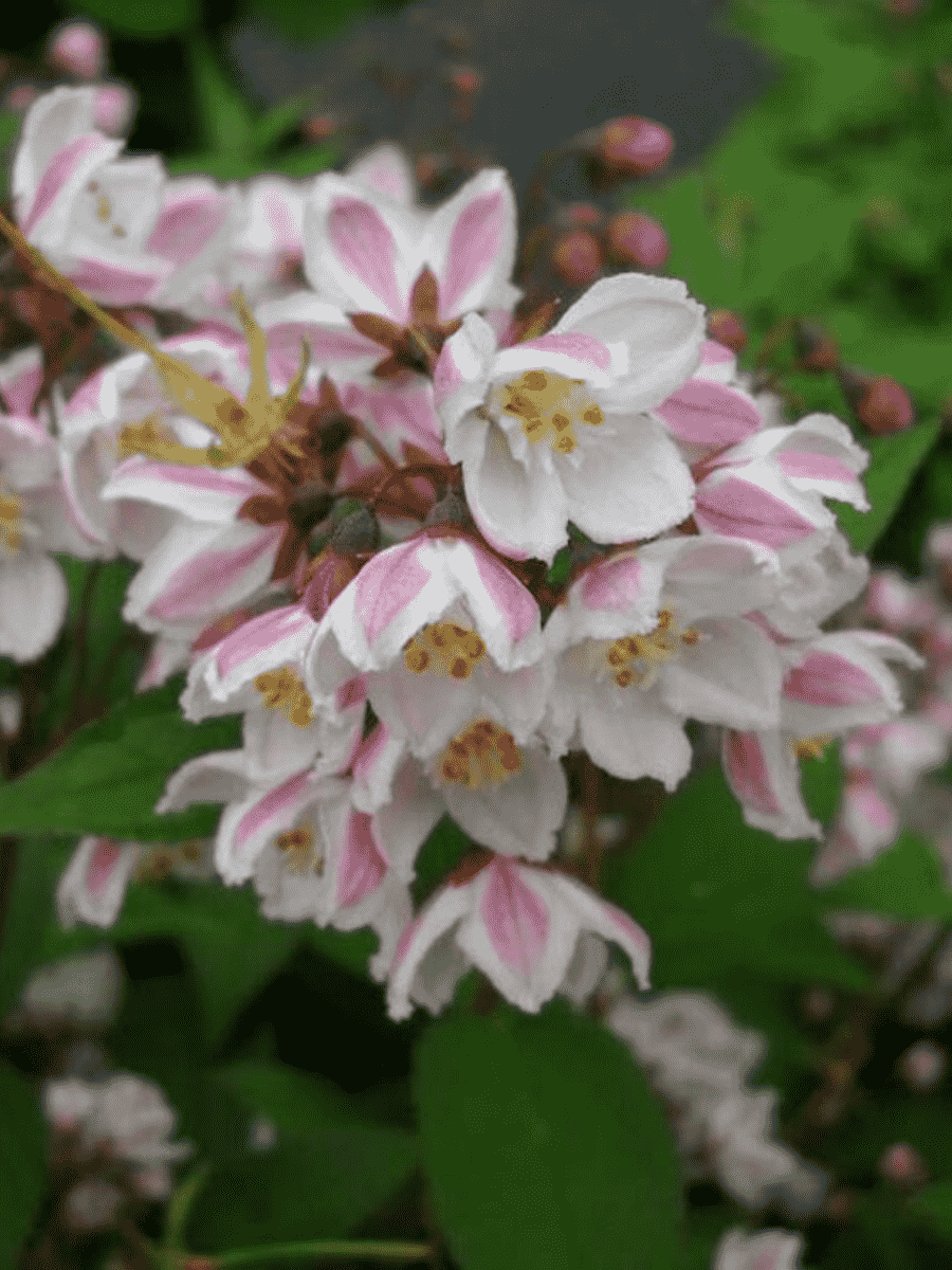 Дейция пурпурная сорта *Kalmiflora* представляет собой элегантную листопадную кустарниковую форму высотой до двух метров, обладающую раскидистой кроной и стройными прямостоячими побегами серовато-коричневого оттенка. Листья овально-ланцетной формы, слегка заострённые на концах, окрашены в насыщенный зелёный цвет летом и приобретают золотисто-жёлтые оттенки осенью, создавая живописную игру красок. Цветки крупные, диаметром около трёх сантиметров, собраны в рыхлые верхушечные соцветия-метёлки длиной от десяти до двадцати пяти сантиметров, распускаются в июне–июле и радуют глаз нежнейшими оттенками розового и сиреневого цветов, переходящими в глубокий фиолетово-пурпурный тон ближе к концу цветения. Растёт быстро, предпочитает солнечные места и плодородные почвы, легко адаптируется к различным климатическим условиям, широко используется в ландшафтном дизайне благодаря своей декоративности и неприхотливости.