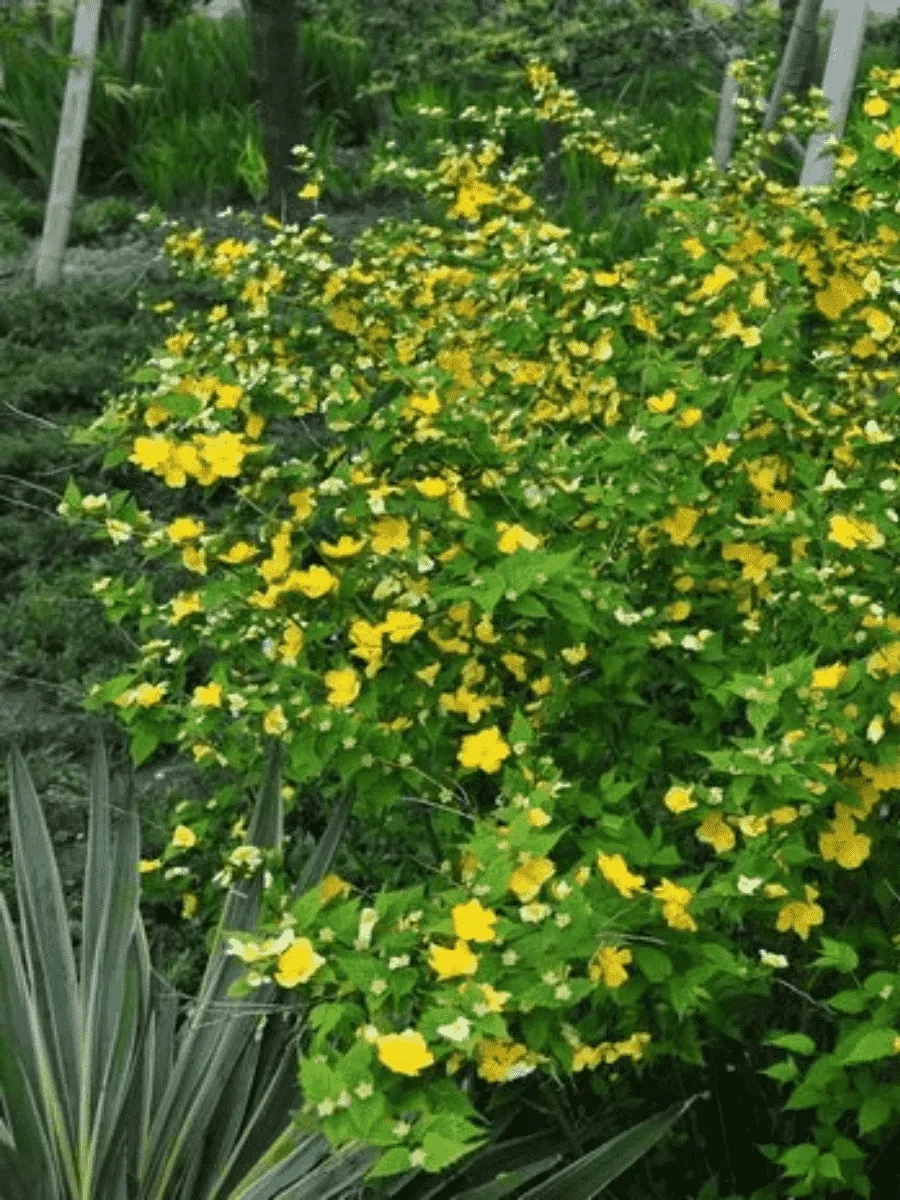 Керрия японская 'Golden Guinea' пленяет взор своей изысканной красотой и нежностью весеннего цветения. Это компактный кустарник высотой до полутора метров с тонкими гибкими побегами, покрытыми гладкой светло-зелёной корой. Листья яйцевидные, слегка зубчатые по краю, ярко-жёлтые весной и летом, постепенно приобретающие золотисто-лимонный оттенок осенью. Цветки крупные, одиночные или собранные в небольшие кисти, распускаются в апреле-мае, радуя глаз яркими солнечными лепестками насыщенного жёлтого цвета, контрастирующими с зелёной листвой. Сердцевина цветка украшена многочисленными тычинками, придающими особую воздушность и лёгкость соцветиям. Растёт быстро, легко переносит стрижку и формирование кроны, предпочитая солнечные места и плодородную почву. Прекрасно подходит для живых изгородей, бордюров и солитерных посадок, создавая атмосферу тепла и радости даже в пасмурные дни.
