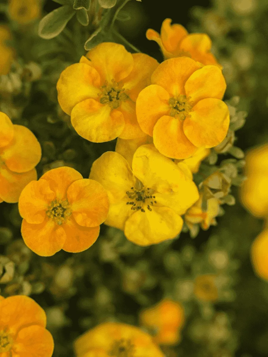 Лапчатка кустарниковая сорта *Mango Tango* представляет собой компактный декоративный куст высотой около полуметра, покрытый густой кроной мелких перисто-рассечённых листочков нежной светло-зелёной окраски, придающих растению воздушность и лёгкость. Цветёт обильно и продолжительно, начиная с конца весны до середины осени, покрываясь множеством ярких цветков диаметром примерно два сантиметра, лепестки которых окрашены в насыщенные оттенки оранжевого цвета с переходом от золотистого центра к ярко-морковному краю, создавая эффект солнечного сияния среди зелёного массива сада. Кустарник отличается неприхотливостью, устойчивостью к засухе и морозостойкостью, прекрасно адаптируется к различным типам почв и условиям освещения, легко размножается черенкованием и сохраняет свою привлекательность даже после окончания цветения благодаря декоративной листве.