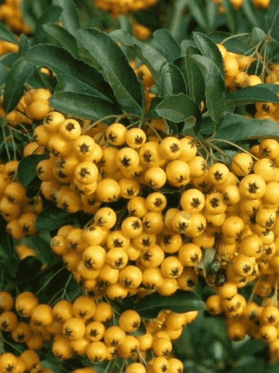 Пираканта *Golden Charmer* пленяет взор своей изысканной красотой и благородством форм. Это вечнозелёный кустарник с густой кроной, достигающий высоты до двух метров, украшенный блестящими кожистыми листьями насыщенно-зелёной окраски, слегка волнистыми по краям и покрытыми золотистым отливом весной и летом. Осенью листья приобретают медово-жёлтые оттенки, создавая живописную игру света и тени среди зелёных ветвей. Цветёт растение обильно мелкими белыми цветами, собранными в пышные щитковидные соцветия, источающие тонкий аромат, привлекающий насекомых-опылителей. Кустарник отличается быстрым ростом, неприхотливостью и устойчивостью к неблагоприятным условиям среды, легко адаптируясь даже в городских условиях. Благодаря декоративности и выносливости пираканту часто используют в ландшафтном дизайне для живых изгородей, бордюров и одиночных посадок, где она становится настоящим украшением сада, радуя глаз круглый год.
