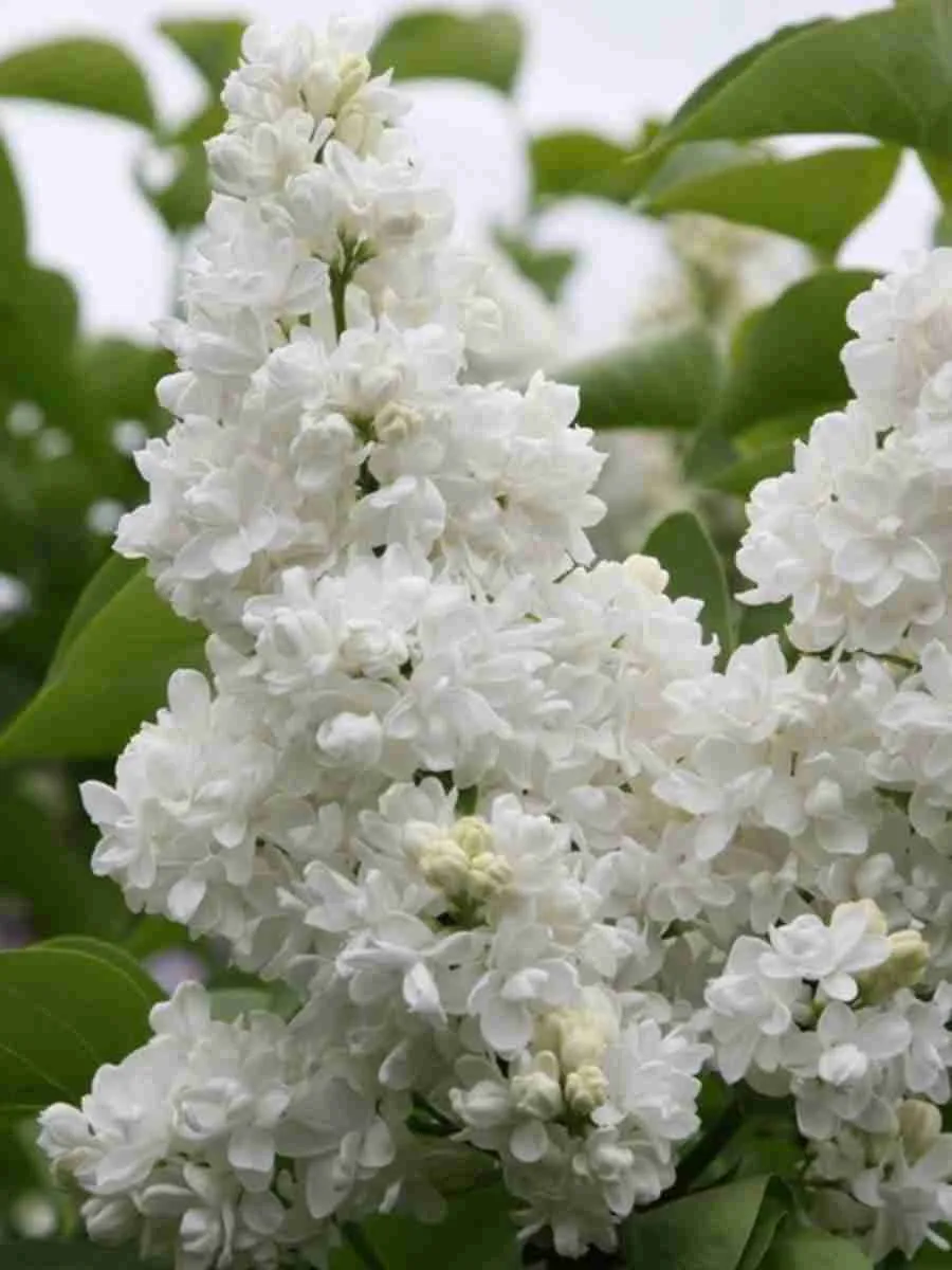 Сирень обыкновенная сорта **Мадам Лемуан** представляет собой роскошную декоративную кустарниковую форму высотой до трёх метров, отличающуюся пышностью кроны и изысканной красотой цветения. Листья крупные, сердцевидные, насыщенно-зелёной окраски, слегка блестящие, придающие растению благородство облика даже вне периода цветения. Цветки собраны в густые пирамидальные соцветия длиной около двадцати сантиметров, состоящие из множества мелких цветков нежнейшего белого цвета с едва уловимым кремовым оттенком, источающих тонкий аромат, наполняющий воздух вокруг сладковатым благоуханием. Период цветения приходится на май-июнь, когда куст буквально покрывается облаком белоснежных цветов, создавая незабываемое зрелище. Растёт медленно, предпочитает солнечные места и плодородные почвы, устойчива к морозу и засухе, широко используется в ландшафтном дизайне парков, садов и частных участков благодаря своей элегантности и способности украшать пространство долгие годы.