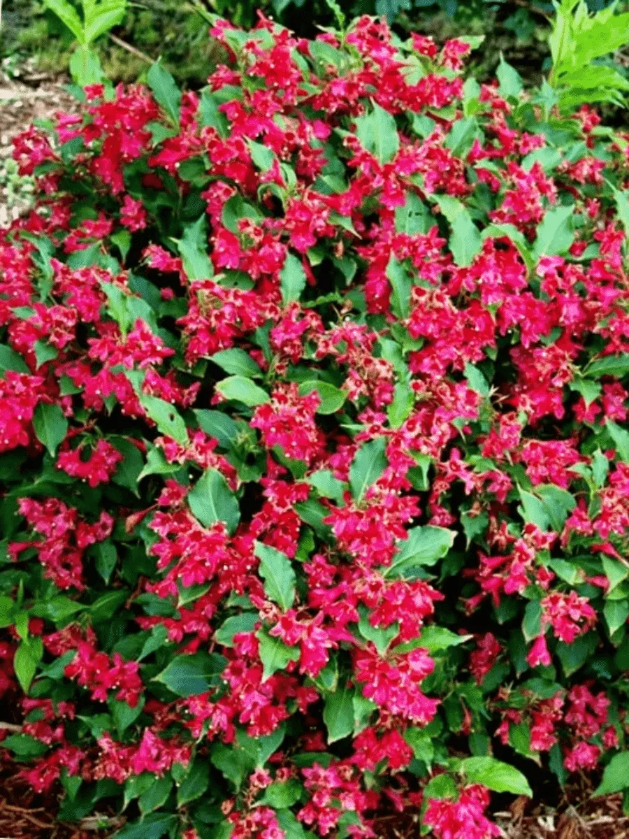Вейгела цветущая сорта *Nain Rouge* — очаровательное декоративное растение семейства Жимолостные (Caprifoliaceae), покоряющее сердца садоводов своей изысканной красотой и нежностью цветения. Это компактный кустарник высотой до одного метра с густой кроной, состоящей из округлых ярко-зелёных листочков, слегка блестящих и гладких, придающих растению свежесть и живость облика даже вне периода цветения. Весной и летом куст покрывается множеством крупных трубчатых цветков насыщенного рубинового цвета, словно драгоценные рубины, сверкающие среди зелени листвы. Цветки собраны в небольшие кисти, украшая собой каждую веточку и создавая впечатление пышного букета, распустившегося прямо на ветвях. Растёт медленно, предпочитая солнечные места и плодородную почву, легко адаптируется к различным условиям выращивания, радуя глаз своим элегантным видом долгие годы.