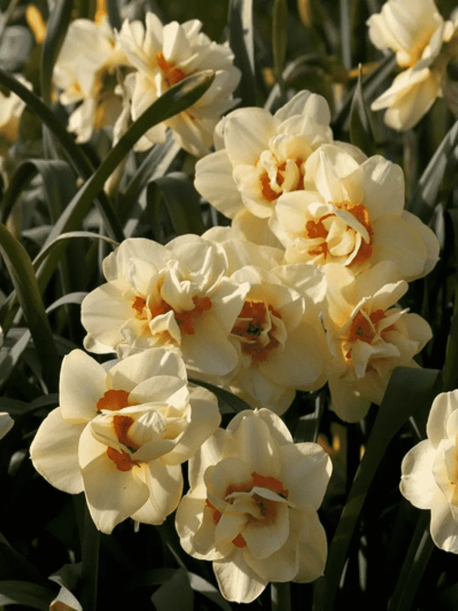 Нарцисс Double Fashion пленяет взор изысканным сочетанием нежности и роскоши, представляя собой элегантную садовую классику. Его листья узколанцетной формы собраны в плотную розетку, окрашены насыщенным зелёным цветом и слегка блестят на солнце, подчёркивая утончённую красоту цветка. Бутоны раскрываются крупными махровыми соцветиями диаметром около восьми сантиметров, демонстрируя многослойность лепестков, плавно переходящих от белоснежного основания к нежно-розовому краю. Серединка цветка украшена контрастным жёлтым кольцом, придающим нарциссу особую декоративность и очарование. Цветёт растение обильно и продолжительно, начиная с конца апреля до середины мая, наполняя воздух тонким ароматом весны. Предпочитает солнечные места с плодородной почвой, легко размножается луковицами и прекрасно подходит для оформления клумб, бордюров и миксбордеров, создавая атмосферу весеннего праздника и гармонии природы.