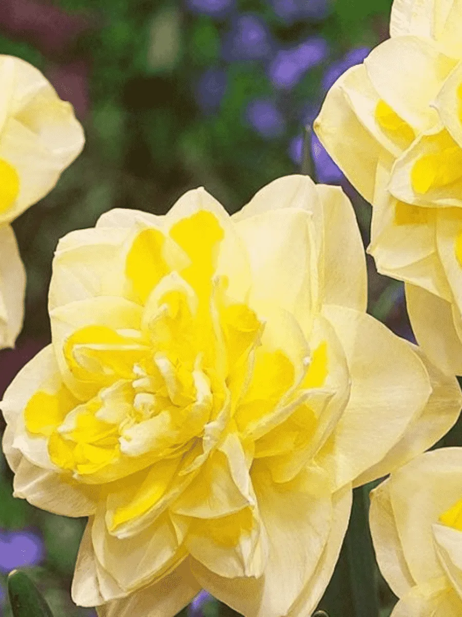 Нарцисс махровый *Sweet Pomponette* пленяет взор нежностью и утончённостью своего облика. Листья узколинейные, ярко-зелёные, гладко блестящие, словно покрытые тонким слоем воскового глянца, образуют аккуратную розетку у основания стебля. Цветонос стройный, прямой, высотой около 35–40 см, несёт один крупный цветок диаметром до 8 см. Лепестки белые, слегка отогнутые назад, окружают пышную сердцевину, состоящую из множества мелких трубчатых лепестков насыщенного жёлтого цвета, придающих соцветию сходство с пушистым помпончиком. Аромат тонкий, сладковатый, едва уловимый, наполняющий воздух весенним настроением. Растение предпочитает солнечные места, хорошо дренированные почвы, легко размножается луковицами, формируя живописные группы на клумбах и газонах. Весной нарциссы распускаются одними из первых, радуя глаз яркими красками после долгой зимы и символизируя приход тепла и обновления природы.