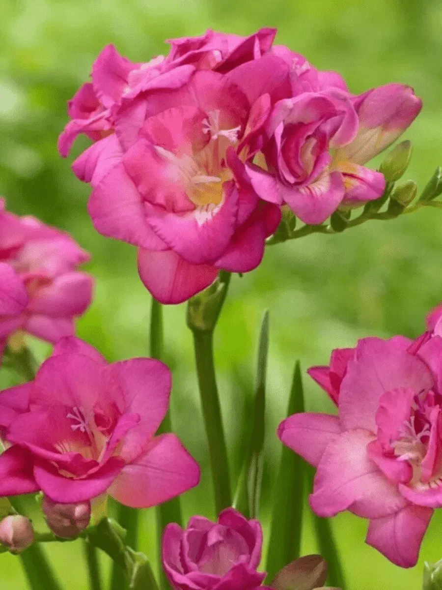 Фрезия Double Pink пленяет взор нежностью розовых лепестков, собранных в пышные махровые соцветия, словно миниатюрные букеты, украшающие стройные стебли высотой до полуметра. Листья узколинейной формы, насыщенно-зелёные, слегка волнистые по краям, придают растению элегантность и утончённость. Цветки располагаются на длинных цветоносах, устремлённых вверх, создавая впечатление лёгкости и воздушности. Аромат цветков тонкий, едва уловимый, наполняющий пространство тонким благоуханием. Родина этой прелестницы — Южная Африка, где она предпочитает солнечные участки с рыхлой плодородной почвой и умеренным поливом. Период цветения приходится на весну-лето, когда растение раскрывается во всей своей красе, радуя глаз изысканной палитрой оттенков от нежно-розового до насыщенного кораллового.