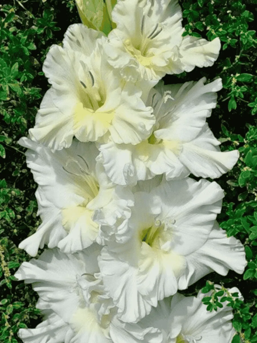 Гладиолус сорта «Мурманск» пленяет взор своей изысканной красотой и благородством форм. Высокий стройный стебель достигает метра высоты, увенчанный роскошной кистью крупных цветков, расположенных каскадом один над другим. Листья узколинейные, длинные и тонкие, словно зелёные мечи, устремлённые вверх, подчёркивая величественную вертикальность всего облика растения. Цветки крупные, диаметром около десяти сантиметров, раскрываются постепенно снизу вверх, демонстрируя всю палитру оттенков от нежнейшего кремово-белого до насыщенного золотисто-жёлтого цвета с едва заметными штрихами тёмно-коричневого тона вдоль лепестков. Бутоны имеют элегантную вытянутую форму, слегка загнутые назад края придают цветкам особую воздушность и лёгкость. Этот гладиолус предпочитает солнечные места и плодородные почвы, радуя садоводов своим продолжительным цветением с июля по сентябрь, когда каждый цветок сияет подобно маленькому солнцу среди зелени северных широт.