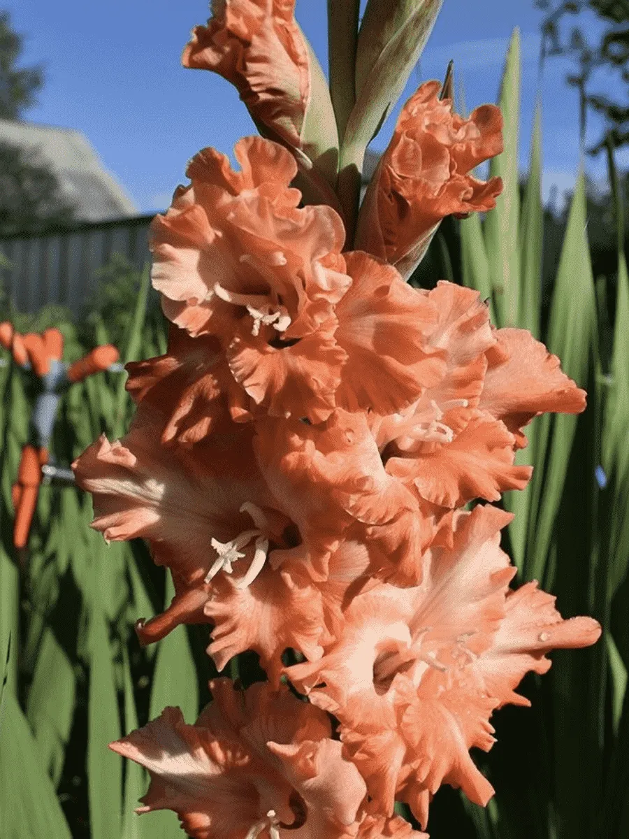 Гладиолус сорта *Shady Frizzle* пленяет взор изысканным сочетанием нежной грациозности и утончённой декоративности. Его высокие стройные стебли достигают метра высоты, увенчанные роскошными соцветиями, состоящими из множества крупных цветков оригинальной формы. Лепестки цветов слегка волнистые, словно кружевная манжета, переливаются оттенками от светло-розового до насыщенного сиреневого цвета, создавая впечатление лёгкого бархата, покрытого тонкой дымкой. Листья узколанцетные, длинные и тонкие, образуют пышную зелёную розетку вокруг основания цветка, подчёркивая элегантность всего облика растения. Цветёт гладиолус продолжительно, радуя глаз яркими красками с конца лета до первых осенних холодов. Предпочитает солнечные места и плодородные почвы, легко адаптируется к различным климатическим условиям, демонстрируя свою неприхотливость и способность украшать сады даже в регионах с умеренным континентальным климатом.