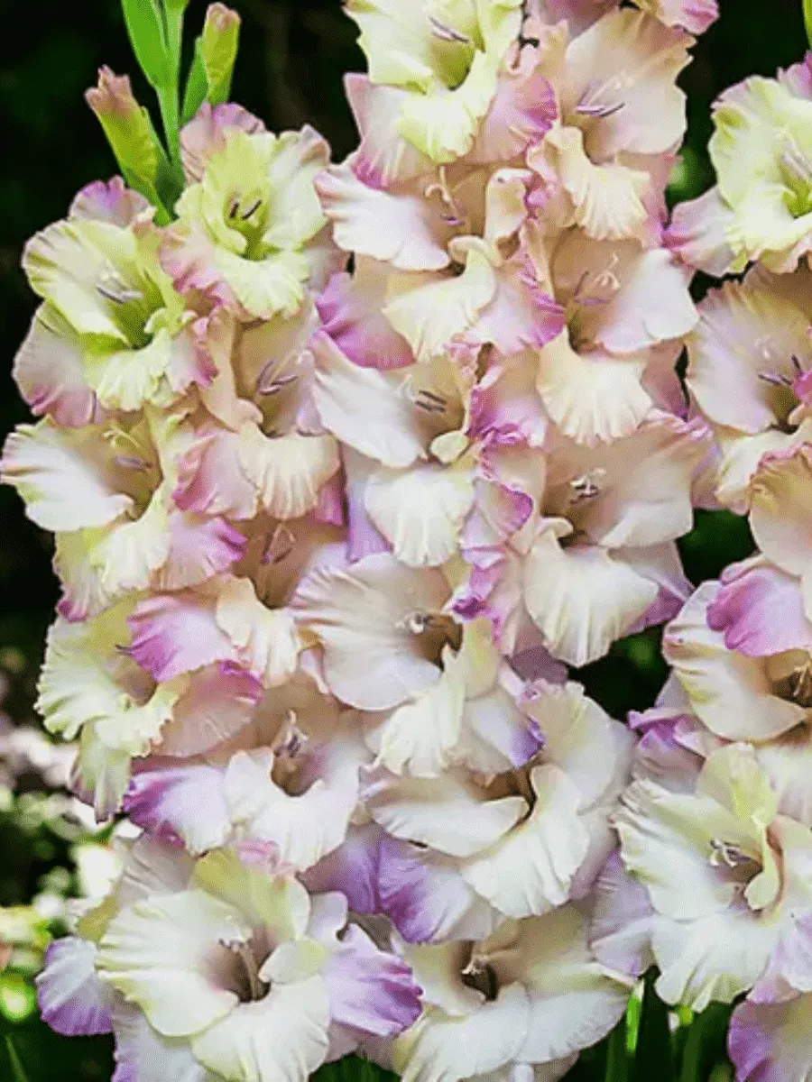 Гладиолус сорта *Tampere* пленяет взор своей изысканной красотой и благородством форм. Высокий стройный стебель достигает метра высоты, увенчанный роскошной кистью крупных цветков, расположенных каскадом один над другим. Лепестки нежных кремово-белых оттенков украшены тонкими розовыми штрихами, придающими соцветию особую утончённость и элегантность. Листья узколинейные, длинные и острые, словно мечи древних воинов, образуют пышную зелёную юбочку вокруг основания цветка. Растение предпочитает солнечные места и плодородные почвы, радуя садоводов продолжительным цветением с июля до сентября. Этот гладиолус идеально подходит для срезки и оформления букетов, даря ощущение гармонии и спокойствия каждому взглянувшему на него.