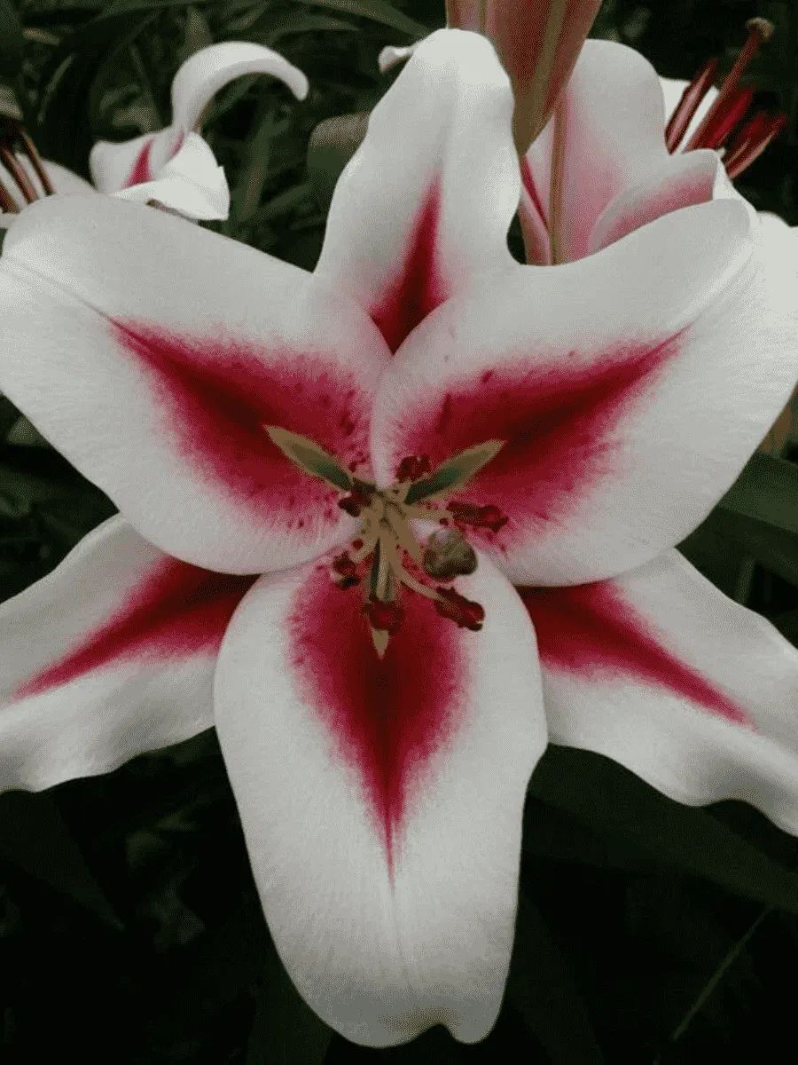Лилия сорта *«Gaucho»* пленяет взор своей изысканной красотой и благородством форм. Высокий стройный стебель достигает метра высоты, увенчанный крупными ароматными цветами, собранными в рыхлые соцветия. Лепестки цветков слегка отогнуты назад, создавая эффект раскрывшегося бутона, словно застывшего в движении танца. Окраска лепестков варьируется от нежнейшей кремово-белой до насыщенно-кремовой с едва заметной розоватостью, переходящей в золотисто-жёлтые тона ближе к центру цветка. Листья ланцетовидные, гладкие, тёмно-зелёные, расположены вдоль всего стебля, придавая растению особую элегантность и завершённость облика. Цветёт лилия обильно и продолжительно, начиная с июля и заканчивая сентябрём, наполняя сад тонким ароматом, который особенно ощутим в вечерние часы. Предпочитает солнечные места с плодородной почвой, хорошо дренированной и умеренно влажной. Разрастается медленно, формируя компактную куртину, идеально подходящую для одиночных посадок или миксбордеров.