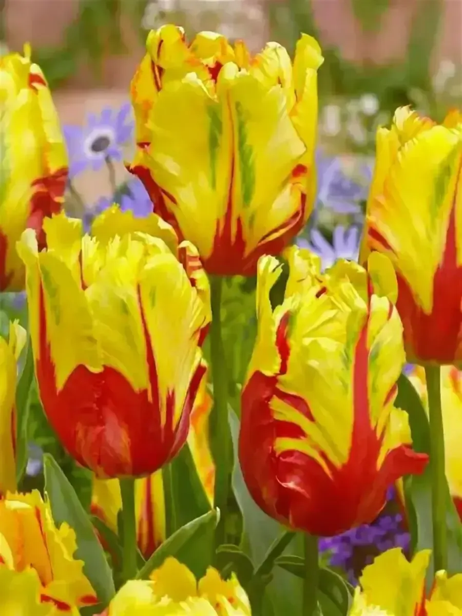 Тюльпан попугайный Техас Флайм – сорт с красивыми разноцветными бутонами. Основной цвет - желтый, по центру лепестков проходят красные и зеленые штрихи.