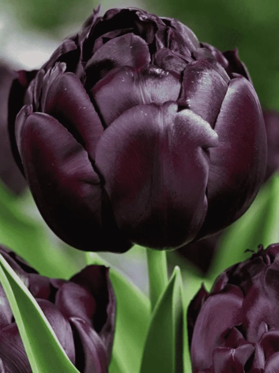 Тюльпан махровый *Black Hero* — роскошная садовая культура, поражающая своей элегантностью и благородством тёмной окраски. Листья удлинённые, гладкие, насыщенно-зелёные, слегка блестящие, подчёркивающие изысканность цветка. Бутоны крупные, округло-овальной формы, раскрываются постепенно, демонстрируя бархатистые лепестки глубокого чёрного цвета с едва уловимым фиолетовым отливом. Цветение продолжительное, начинается поздней весной и длится около двух недель, создавая эффектную композицию в саду. Растение предпочитает солнечные участки с плодородной почвой, устойчиво к холоду и ветрам, прекрасно адаптируется к различным климатическим условиям умеренной зоны. Высота стебля достигает 50–60 см, обеспечивая гармоничность композиции среди других растений. Этот тюльпан станет истинным украшением любого сада благодаря своему величественному облику и утончённой красоте.