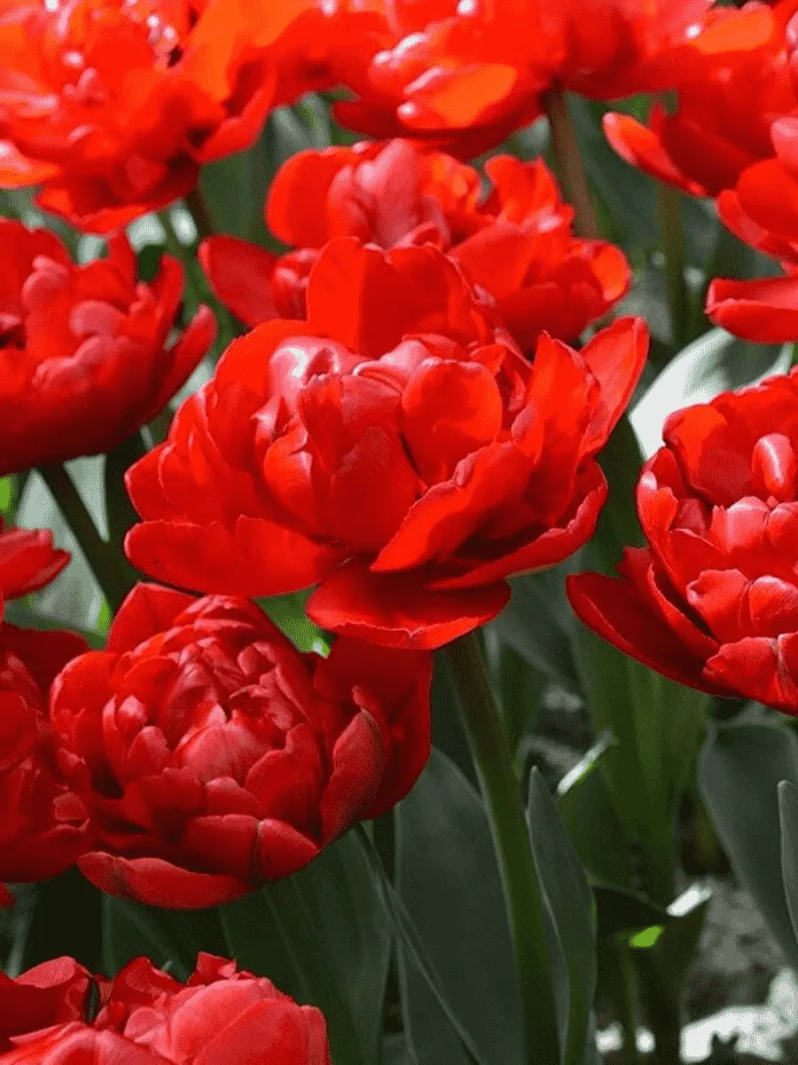 Тюльпан махровый *Largo* пленяет взор своей изысканной красотой и благородством форм. Высокий крепкий стебель высотой до 65 см несет крупные бутоны насыщенного рубиново-красного цвета с бархатистым отливом, словно драгоценность, сверкающая в лучах весеннего солнца. Листья удлиненные, темно-зеленые, гладкие и блестящие, подчеркивая элегантную простоту облика цветка. Цветки раскрываются широко, демонстрируя многочисленные лепестки, собранные в пышную розетку, создавая впечатление роскошной ткани, искусно собранной складками. Период цветения приходится на конец апреля—май, когда растение предстает во всей красе, украшая сады и парки нежностью своего великолепия. Этот сорт предпочитает солнечные места с плодородной почвой, легко адаптируется к различным климатическим условиям и способен радовать глаз долгие годы, становясь истинным украшением любого участка.