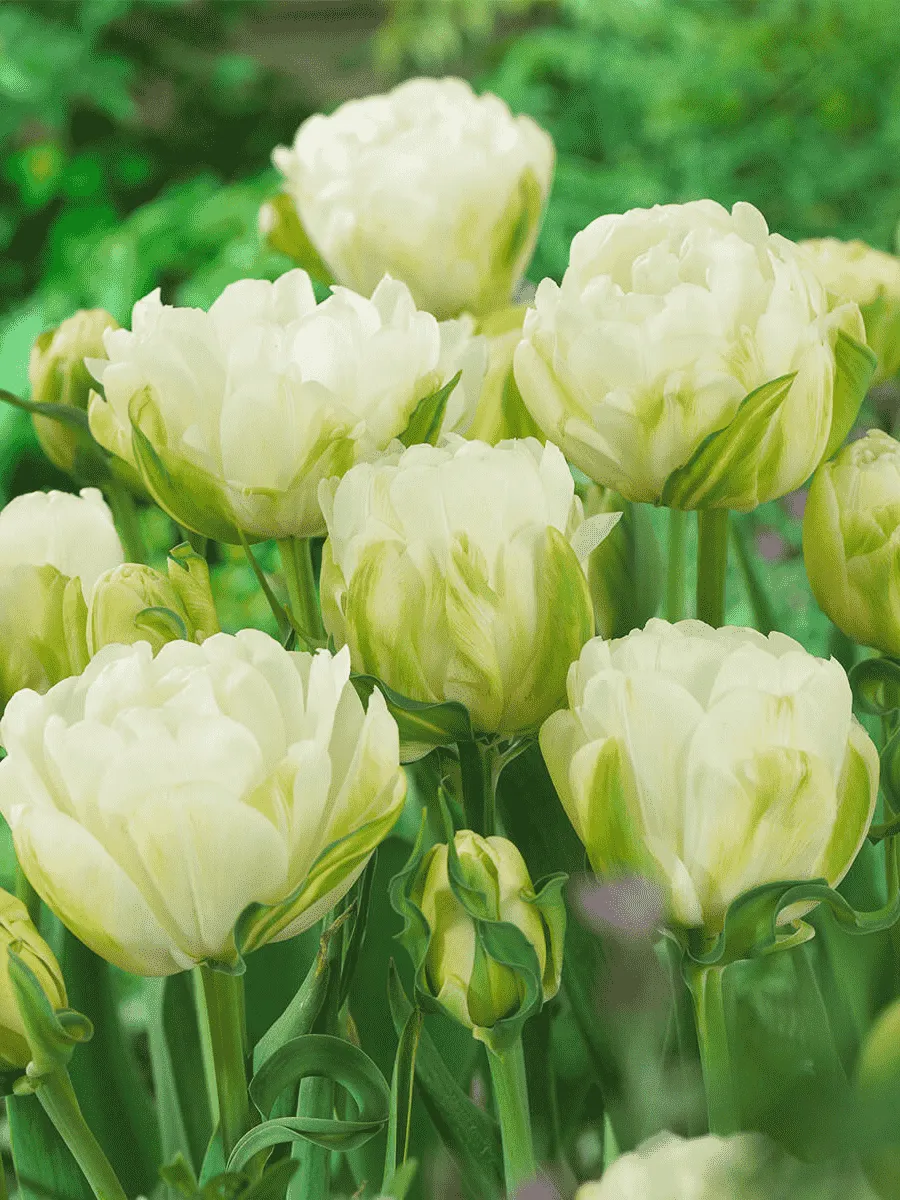 Тюльпан махровый Маурен Дабл (Tulipa 'Maureen' Double) представляет собой изысканное растение семейства лилейных, поражающее своей утончённой красотой и элегантностью форм. Его крупные цветки достигают диаметра до 15 см, раскрываясь пышной многослойной короной белоснежных лепестков, словно сотканных из нежнейшего шёлка. Листья удлинённые, гладкие, насыщенно-зелёного цвета, слегка блестящие, подчёркивающие контрастную чистоту цветков. Высота стебля варьируется от 40 до 60 сантиметров, позволяя растению уверенно возвышаться над поверхностью почвы, демонстрируя свою роскошь во всей красе. Цветёт тюльпан Маурен Дабл поздней весной, радуя глаз продолжительностью цветения около двух недель. Предпочитает солнечные места с плодородной рыхлой почвой, устойчив к холоду и хорошо переносит умеренные климатические условия средней полосы России.