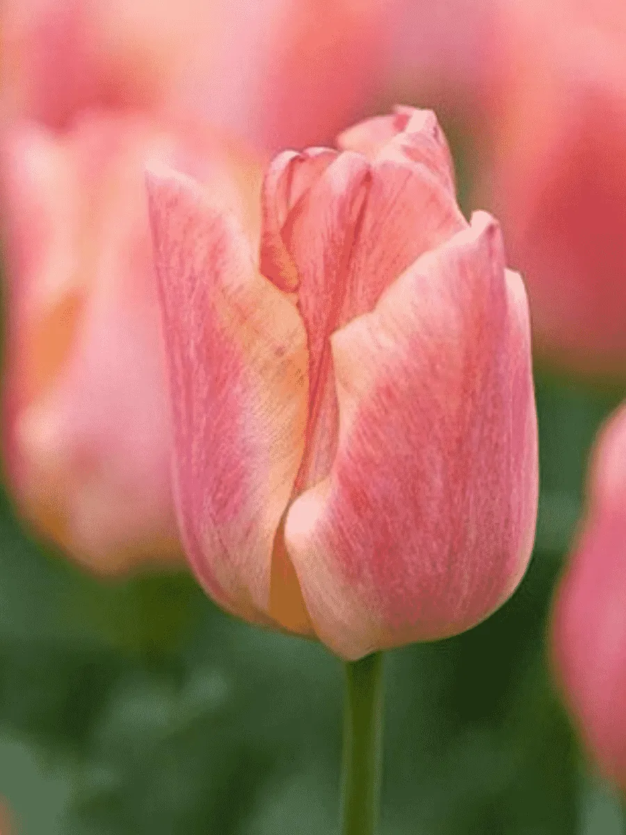 Тюльпан сорта *Passio Sweet* пленяет взор нежностью лепестков, переливающихся оттенками от розового до кремово-белого цвета, словно облачённых в лёгкую дымку утреннего тумана. Его крупные цветки чашевидной формы раскрываются навстречу солнечным лучам, демонстрируя изысканный переход оттенков от основания к краям лепестков. Листья удлинённые, гладкие, насыщенно-зелёного оттенка, подчёркивающие элегантность стебля высотой около сорока сантиметров. Цветёт тюльпан ранней весной, наполняя сад тонким ароматом свежести и весенней радости. Растение предпочитает солнечные участки с плодородной почвой, легко адаптируется к различным климатическим условиям и прекрасно подходит для выращивания как в открытом грунте, так и в горшечной культуре. Этот сорт станет украшением любого сада благодаря своей утончённой красоте и способности создавать атмосферу гармонии и спокойствия.