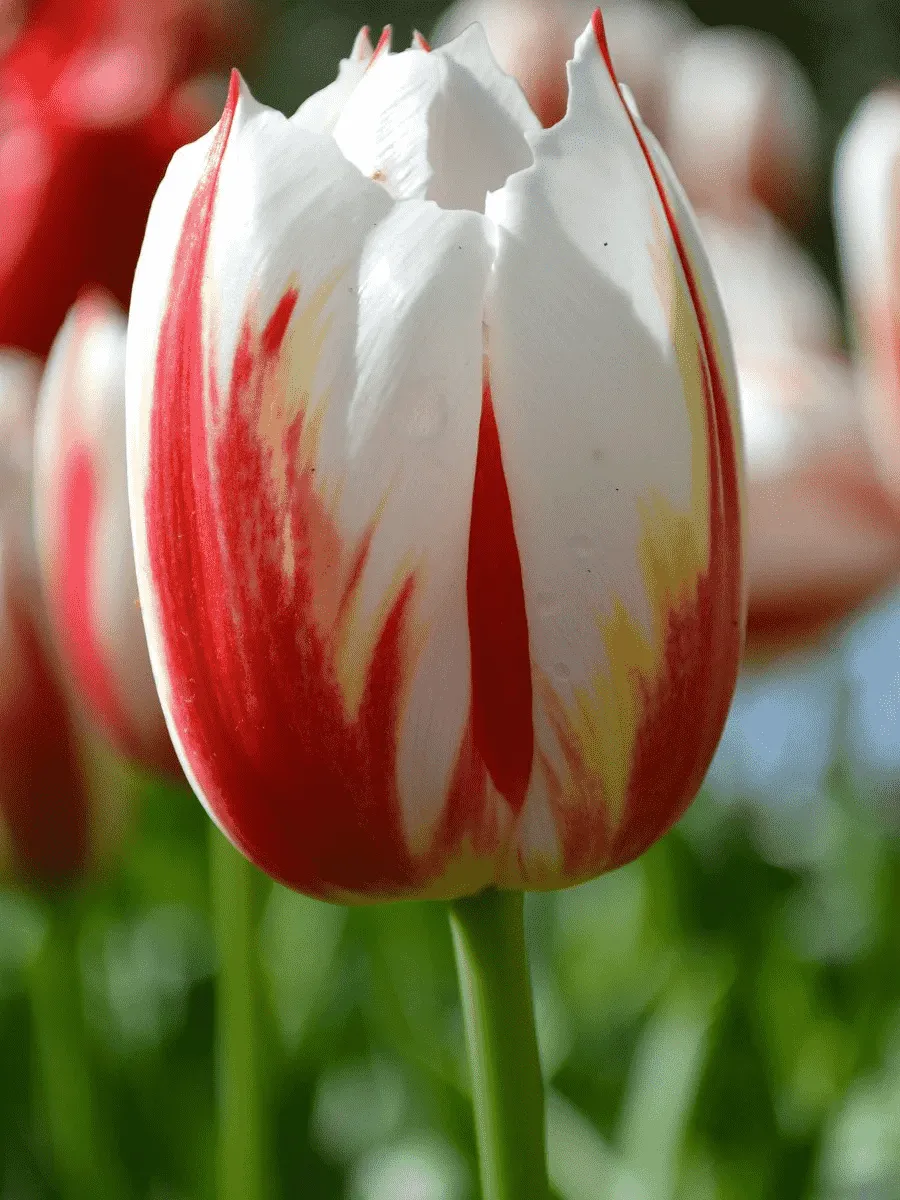 Тюльпан пестролистный *Happy Generation* пленяет взор изысканным сочетанием нежной зелени и ярких лепестков, словно воплощением весеннего праздника природы. Его листья широкие, гладкие, насыщенно-зелёные, слегка блестящие, подчёркивающие элегантность цветка. Бутоны раскрываются крупными чашевидными цветами, демонстрируя удивительную игру оттенков от кремово-белого до нежно-розового и золотисто-жёлтого, создавая впечатление солнечного сияния среди зелёного ковра. Высота стебля варьируется от 45 до 60 см, позволяя растению уверенно возвышаться над окружающими травами и кустарниками. Цветёт тюльпан ранним летом, радуя глаз своей красотой около двух недель. Предпочитает солнечные места с плодородной почвой, легко адаптируется к различным климатическим условиям, распространяя свою чарующую прелесть в садах и парках Европы и Азии.