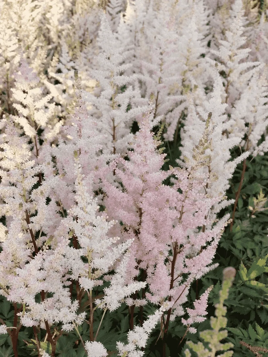 Астильба Арендса сорта *Bumalda* пленяет взор нежностью своего облика и изысканностью форм. Это многолетнее травянистое растение образует пышную куртину высотой до полуметра, украшенную крупными перисто-рассечёнными листьями насыщенного тёмно-зелёного цвета с глянцевой поверхностью, придающей растению благородство и утончённость. Цветёт астильба продолжительно, начиная с середины лета и заканчивая осенью, покрываясь воздушными метельчатыми соцветиями розово-пурпурного оттенка, словно облачённая в лёгкий полупрозрачный покров. Её тонкие стебли устремляются вверх, поддерживая хрупкую красоту цветов, создавая впечатление невесомости и легкости. Растение предпочитает тенистые уголки сада, влажные почвы и хорошо переносит полутень, становясь украшением любого участка благодаря своей декоративности и неприхотливости.