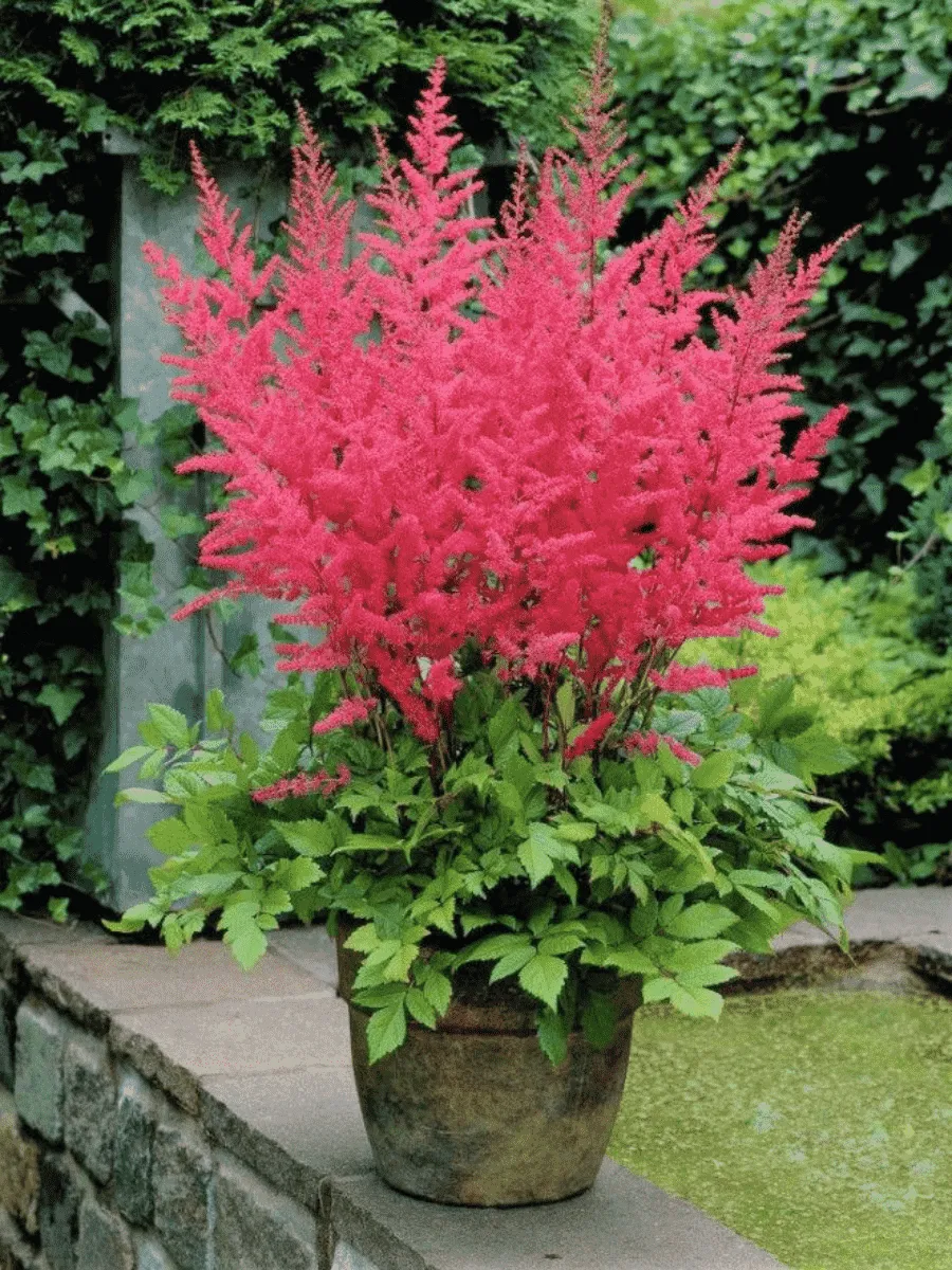 Астильба Арендса сорта *Granat* пленяет взор роскошной зеленью перистых рассечённых листьев, украшенных нежным восковым напылением, придающим растению благородную матовую дымку. Изящная композиция листовых пластин словно соткана искусством природы, создавая живописную игру света и тени среди тенелюбивых уголков сада. Но истинное великолепие раскрывается летом, когда над пышной зелёной массой поднимаются густые пирамидальные соцветия насыщенного гранатового оттенка, источающие тонкий аромат свежести и гармонии. Цветки мелкие, многочисленные, собранные в плотные кисти, создают эффект струящихся ручейков цвета, плавно перетекающих от основания до вершины каждого стебля. Растение предпочитает влажные, плодородные почвы и полутень, где оно разрастается компактными кустиками, постепенно формируя живописные заросли, способные украсить любой уголок сада своей утончённой красотой и элегантностью.
