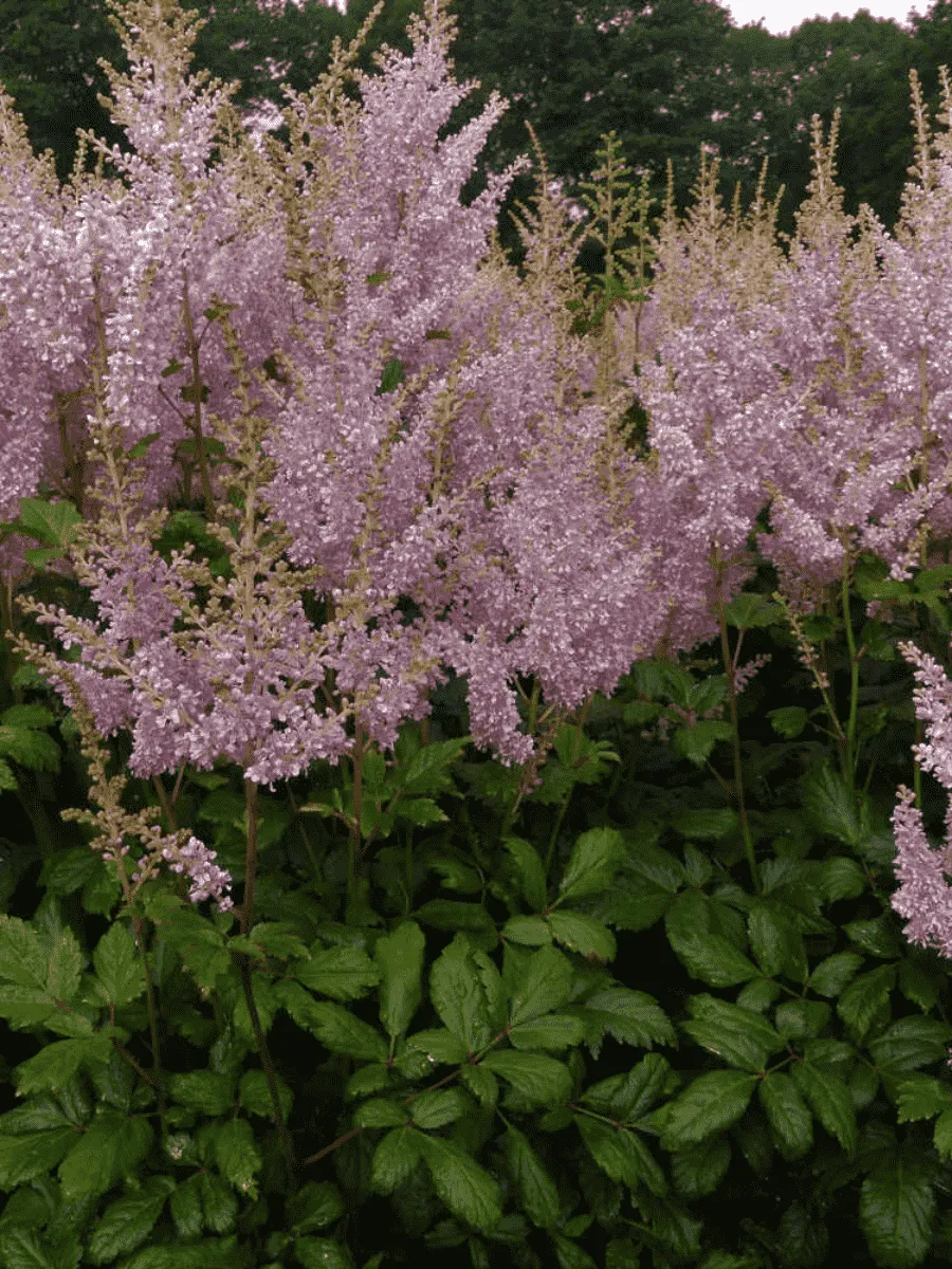 Астильба Арендса 'Punk Rock' пленяет взор роскошной листвой насыщенного бронзово-зелёного оттенка, украшенной серебристо-белым крапом, придающим ей эффектную контрастность и декоративность даже вне периода цветения. Листья перисто-рассечённые, крупные, слегка гофрированные, создают живописную композицию, подчёркивая изысканность каждого элемента. Цветоносы устремляются вверх стройными свечами высотой до метра, увенчанные пышными метельчатыми соцветиями густого пурпурно-красного цвета, словно искрящимися огнём среди зелени сада. Период цветения длится долго, начиная с середины лета и продолжаясь вплоть до осени, наполняя пространство утончённым ароматом и привлекая внимание своей элегантностью и благородством форм. Растение предпочитает полутень и влажные почвы, прекрасно адаптируется к условиям средней полосы России, становясь украшением тенистых уголков садов и парков, где оно раскрывается во всей красе, создавая атмосферу гармонии и природной красоты.