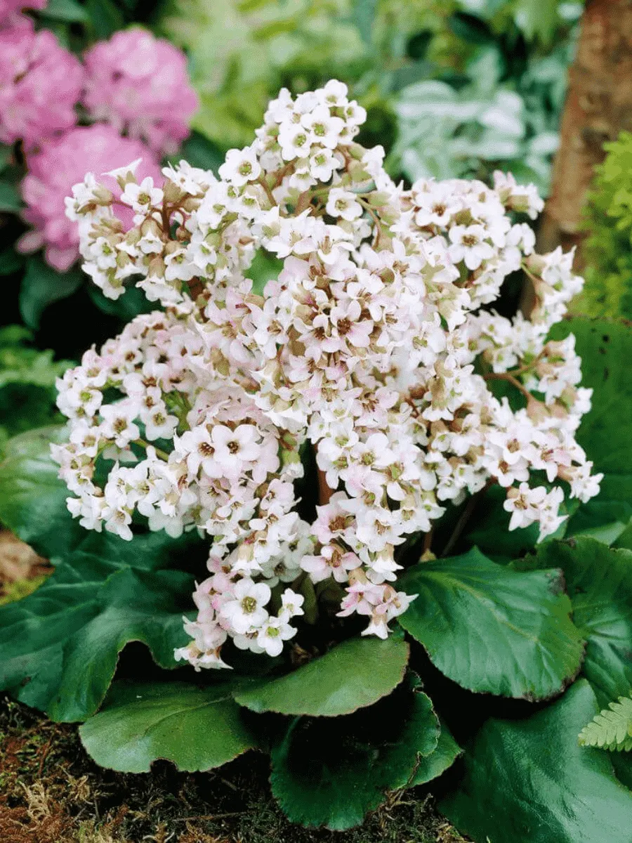 Бадан New Hybrids — роскошная садовая культура, поражающая своей изысканной красотой и благородством форм. Это многолетнее травянистое растение образует плотную куртину крупных кожистых листьев насыщенно-зелёной окраски, слегка блестящих и покрытых восковым налетом, придающим особую глубину оттенкам зелени. Листья сердцевидной формы, крепятся на длинных черешках, создавая живописную композицию даже зимой благодаря способности сохранять декоративность до весны следующего года. Цветки бадана собраны в крупные соцветия-метёлки, возвышающиеся над листвой на прочных стеблях высотой около полуметра. Окраска цветков варьируется от нежно-розового до глубокого малинового оттенка, иногда переходящего в пурпурный тон, придавая растению особое очарование и элегантность. Период цветения длится долго, начиная с конца мая и продолжаясь почти весь июнь, наполняя сад нежностью и ароматом. Растёт медленно, предпочитая полутень и влажные плодородные почвы, легко размножается делением корневищ и прекрасно подходит для оформления теневых уголков сада, рокариев и альпийских горок.