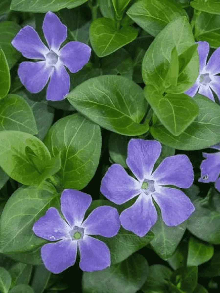 Барвинок большой (Vinca major), многолетнее травянистое растение семейства Кутровые, пленяет взор своей вечнозелёной листвой и нежностью цветения. Стелющиеся побеги образуют плотную зелёную массу, укрывающую почву бархатистым ковром. Листья крупные, яйцевидные, кожистые, тёмно-зелёные, блестящие, словно отполированные природой до зеркального блеска. Цветки одиночные, широко раскрытые, венчают собой длинные цветоножки, распускаясь крупными звёздочками глубокого синего цвета с едва заметным фиолетовым отливом. Сердце цветка украшено тонкой жёлтой трубочкой, придающей особую утончённость общему облику. Растёт преимущественно в тенистых местах, предпочитая влажные почвы и защищённые участки садов и парков, где создаёт живописные композиции, радуя глаз своим спокойствием и благородством.