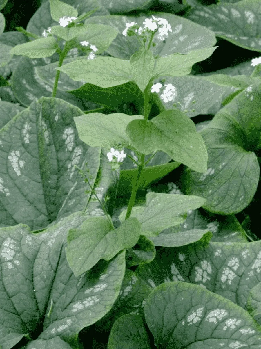 Бруннера крупнолистная 'White Zebra' пленяет взор крупными сердцевидными листьями изумрудной зелени, украшенными широкими белыми полосами вдоль жилок, словно изысканным каллиграфическим узором. Листья плотные, слегка морщинистые, придают растению благородную декоративность даже вне периода цветения. Весной среди густой листвы появляются нежные голубовато-сиреневые цветки-колокольчики, собранные в рыхлые соцветия-метёлки, дарящие саду весеннее очарование. Растение предпочитает полутень и влажные плодородные почвы, прекрасно разрастается, формируя живописные куртины высотой до полуметра и шириной около метра, создавая эффектные зелёные акценты в тенистых уголках сада.