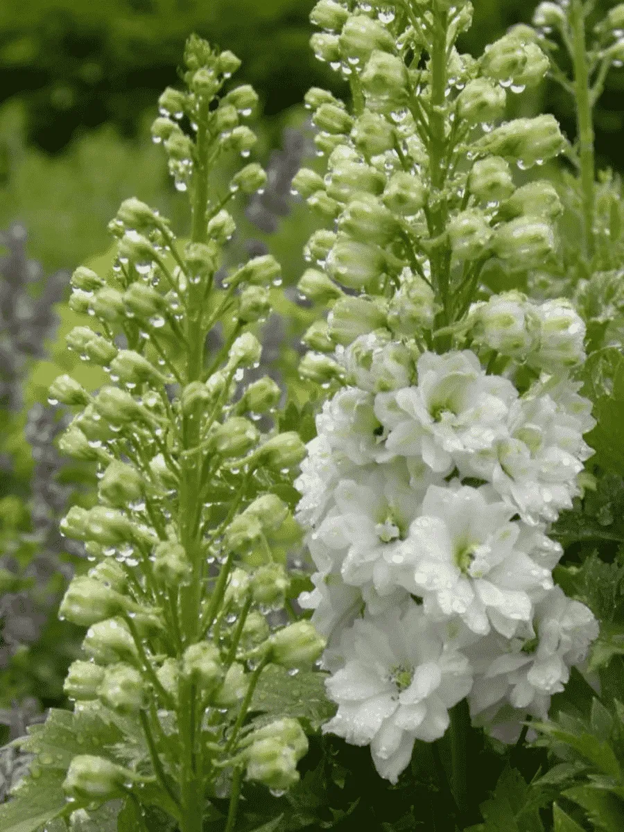 Дельфиниум культурный Pacific Giant Galahad — величественное растение с мощной прямостоячей стеблевой системой высотой до полутора метров, украшенное крупными рассечёнными листьями насыщенного зелёного цвета, слегка блестящими от воскового налёта. Его пышная крона состоит из множества крупных соцветий пирамидальной формы, состоящих из густо расположенных цветков нежнейшего кремово-белого оттенка с едва заметным лимонным подтоном и тёмно-фиолетовым глазком в центре каждого цветка. Цветение начинается в июне и продолжается около месяца, наполняя сад изысканным ароматом и создавая впечатление воздушной белоснежной дымки среди зелени сада. Растёт быстро, предпочитает солнечные места и плодородную почву, устойчив к холоду и засухе, легко размножается семенами и черенкованием, широко используется в ландшафтном дизайне благодаря своей декоративности и способности создавать эффектные акценты в композициях.